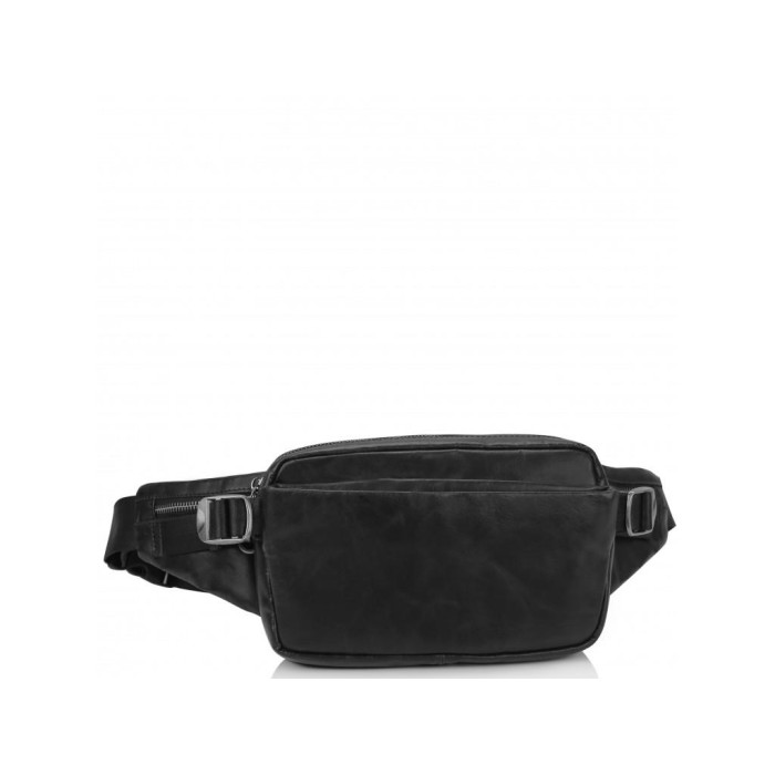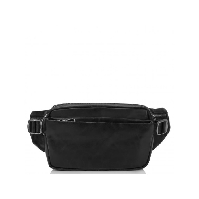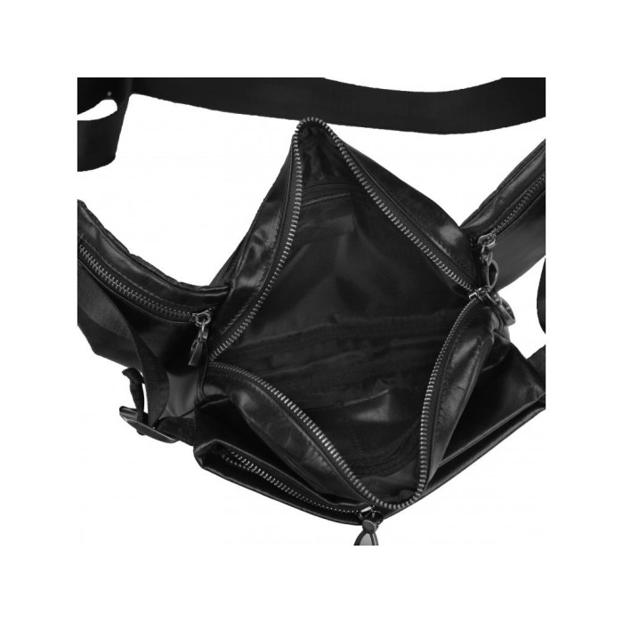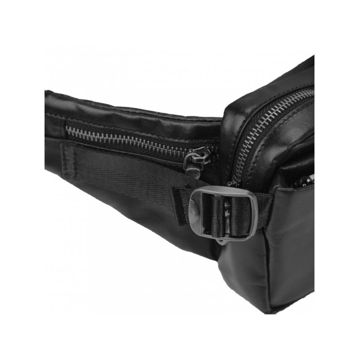 Для пошива сумки была использована натуральная кожа черного цвета. Форма сумки бананки простая и удобная, но при этом она выглядит очень стильно. Для ношения мужской сумки на пояс используется поясной ремень, он регулируется по объему и фиксируется за счет пластиковой застежки фастекс. Основное отделение закрывается на молнию. С лицевой и тыльной стороны есть по одному карману на молнии. Внутри сумки размещен маленький карман на молнии, карман открытого типа и 6 слотов для карт.