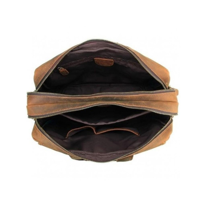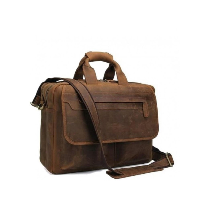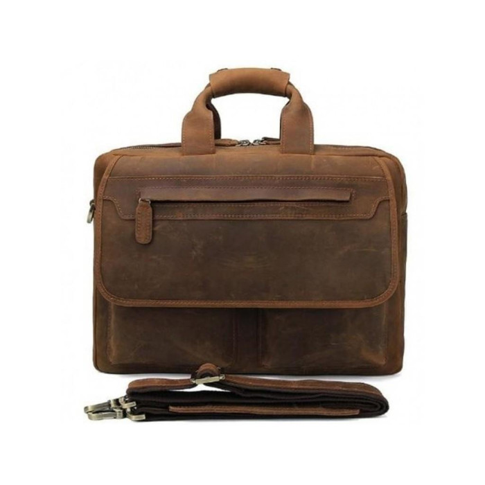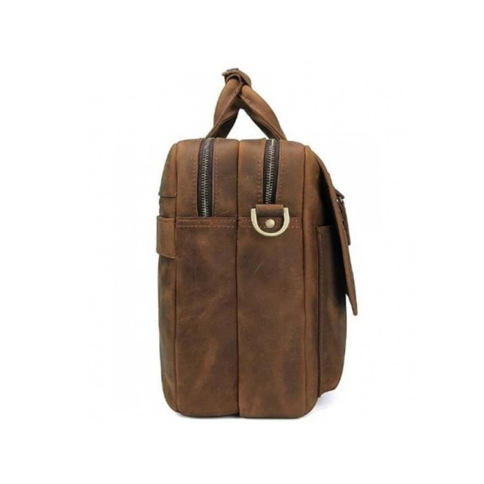Удобный мужской портфель с винтажной кожи. Фурнитура сумки имеет золотистый цвет. Плечевой ремень регулируется по длине имеет плечевую накладку для удобной переноски. Сумка оснащена двумя основными отделениями на молнии внутри которых расположены маленькие карманы для мелочей, а также карман для гаджета. С лицевой стороны под клапаном, который закрывается на магнитные кнопки, расположено два накладных кармана, на клапане есть замок на молнии горизонтального типа. С тыльной стороны также расположен карман на молнии.