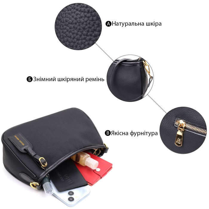 Каркасная полукруглая женская сумка из натуральной качественной кожи. Аксессуар состоит из основного отделения, которое закрывается на молнию и клапан с магнитом, потайного кармана на молнии и кармана открытого типа внутри, а также кармана снаружи на тыльной стороне. Носить сумку можно в руке, на плече и через плечо для этого имеется съемные два кожаных ремешка. В аксессуаре использована качественная фурнитура цвета серебра.
