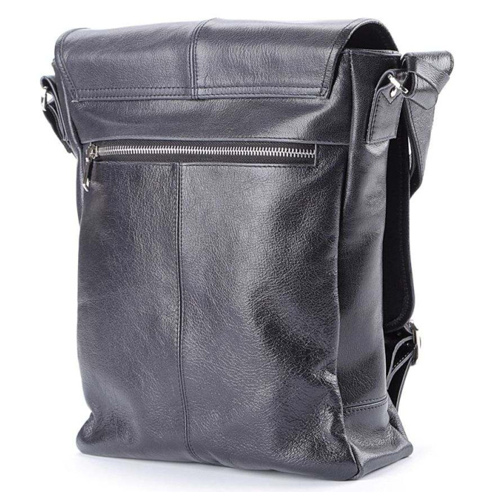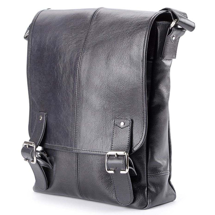 Большая кожаная мужская сумка высочайшего качества. Аксессуар выполнен из кожи черного цвета. Кожа мягкая, приятная на ощупь. Цвет фурнитуры: серебро. Сумка аккуратно прошита сверхпрочной нитью черного цвета. На задней внешней стороне аксессуара расположено отделение на молнии. Данная модель носиться через плечо. Плечевой ремень выполнен в комбинации натуральной кожи и прочного текстильного материала. Сумка закрывается при помощи клапана и 2-х кожаных хлястиков на магнитных кнопках, а также молнией. Под клапаном находится вместительный накладной карман. Подкладка выполнена из прочного текстильного материала черного цвета.