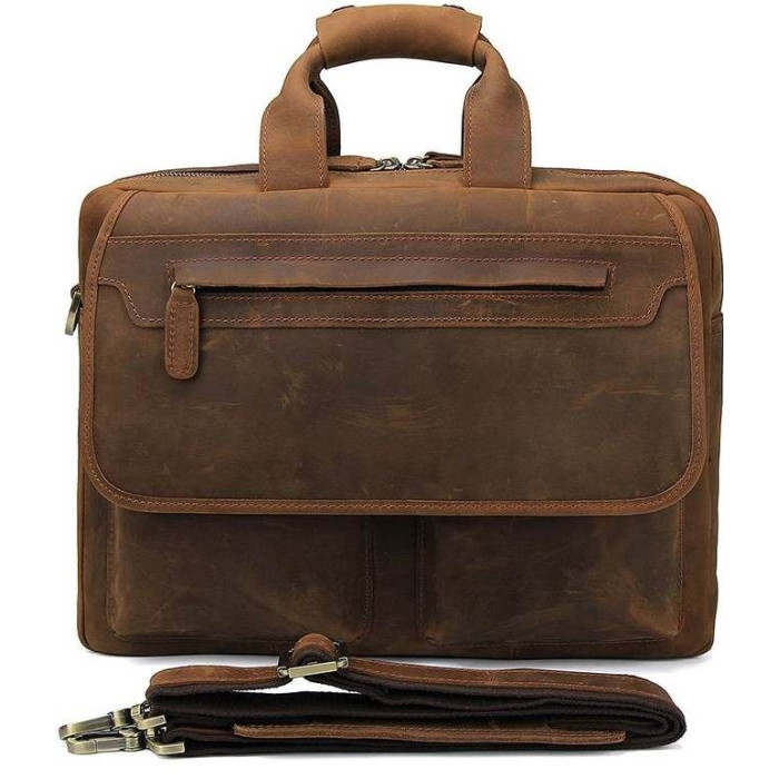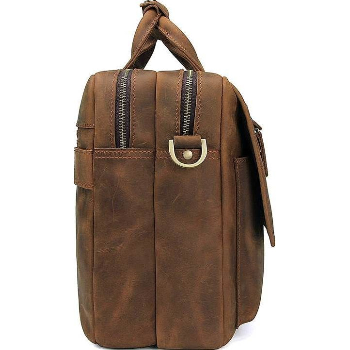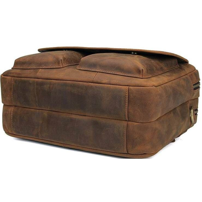 Функциональная сумка коричневого цвета, из качественной натуральной винтажной кожи. Цвет фурнитуры: латунь. На лицевой стороне находятся два накладных кармана, под клапаном, что закрывается двумя магнитами. На клапане находится карман на молнии. На задней внешней стороне расположено большое отделение на молнии, а также пришитый кожаный ремень, который можно повесить на выдвижную ручку чемодана. Подкладка выполнена из прочного текстильного материала темно-коричневого цвета.