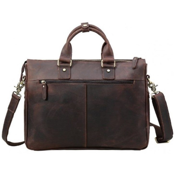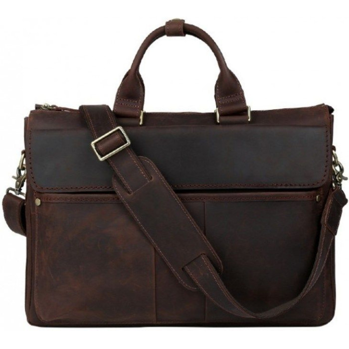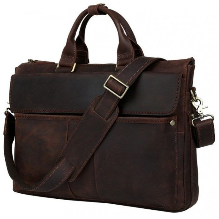 Вместительная мужская сумка из натуральной высококачественной кожи. Цвет фурнитуры: латунь. Сумку можно носить в руке при помощи кожаных ручек, а также через плечо, в комплекте съемный плечевой ремень из сочетания прочного текстиля и кожи. Аксессуар прошит коричневой прочной нитью, что придает изделию прочности и оригинального вида. Аксессуар закрывается на молнию. На лицевой стороне изделия расположено два кармана, один на молнии, другой под клапаном на магнитах. На задней внешней стороне находится отделение на молнии. Подкладка выполнена из прочного текстильного материала черного цвета.