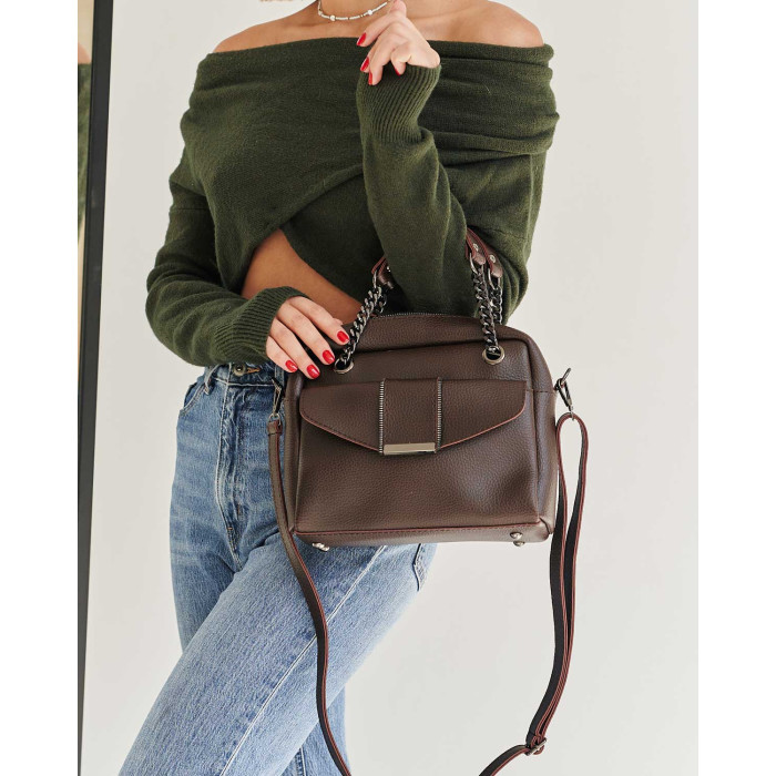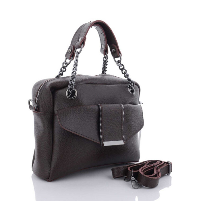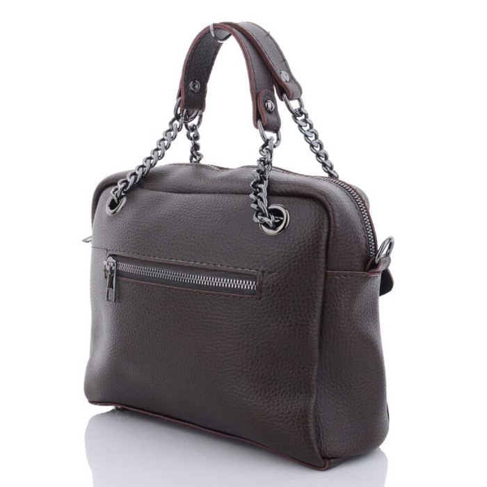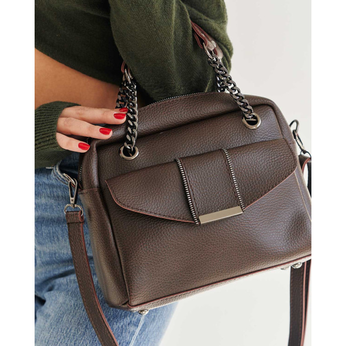 Стильная молодежная женская сумка 56605 из кожзаменителя высокого качества, цвет коричневый. Сумка открывается при помощи молнии. Спереди сумки есть полноценное отделение на клапане. Ручки сумки выполнены с дополнительным аксессуаром - цепочкой. Сумка на подкладке, имеет внутри два кармана: открытый и на молнии. Сзади имеется карман для мелких предметов.