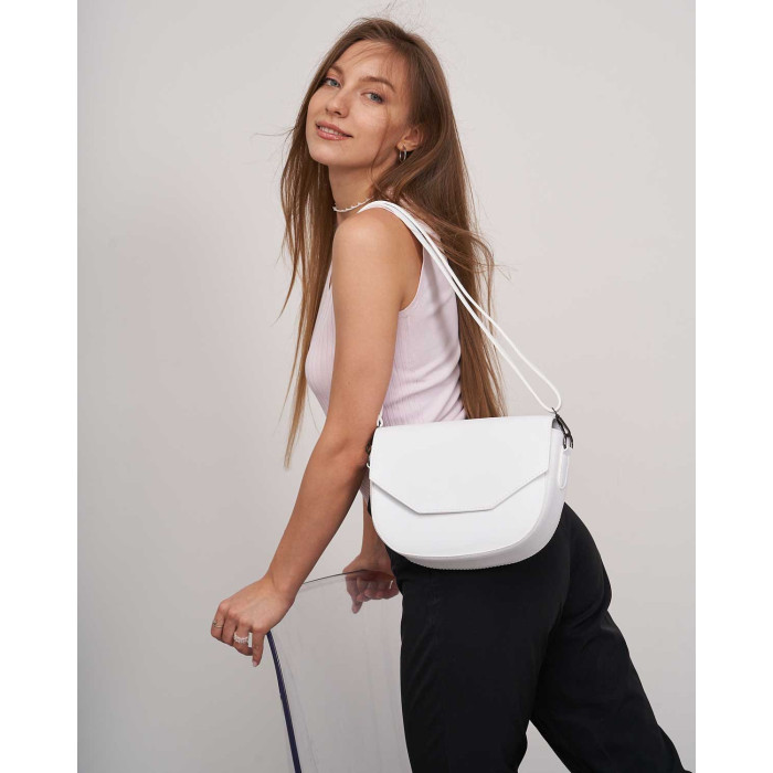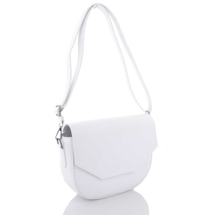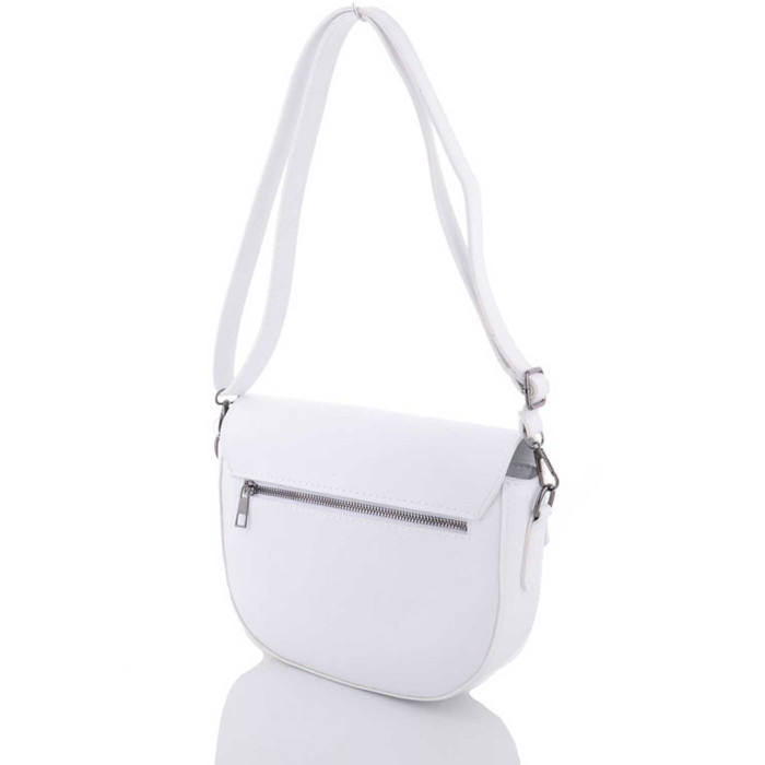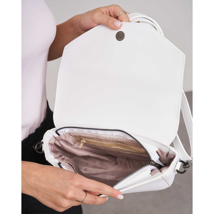 Женская сумка 69300 цвет белый, из экокожи высокого качества (материал похож на кожу). Сумка открывается при помощи магнитов и молнии. Внутри на подкладке, имеет два кармана: открытый и на молнии. Снаружи есть карман для мелких предметов. Имеется плечевой ремень, который регулируется под разную длину, максимальная длина плечевого ремня 135 см.