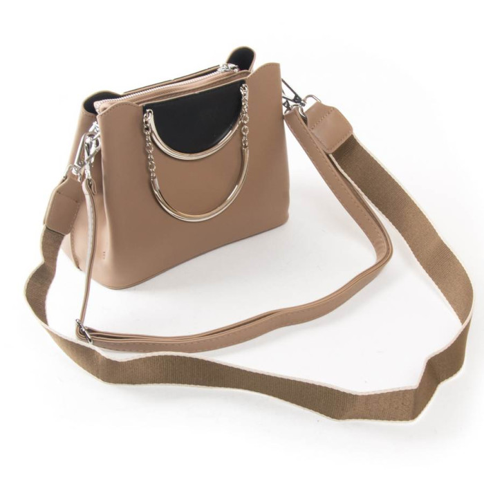 Женская сумочка Fashion. Три отделения: боковые закрываются на магнитные кнопки, а центральное на молнию. Внутри есть боковой карман на молнии и открытый карман. В комплекте регулируемый плечевой ремень и широкий ремень.