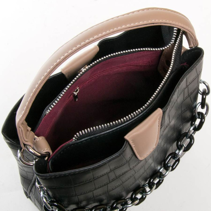 Женская сумочка Fashion. Три отделения: боковые закрываются на магнитные кнопки, а центральное на молнию. Внутри есть боковой карман на молнии и открытый карман. В комплекте регулируемый плечевой ремень и широкий ремень.