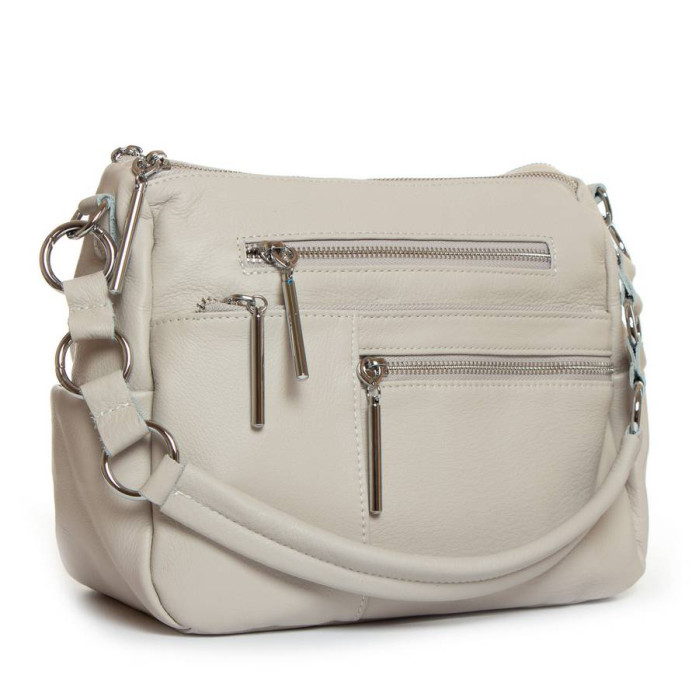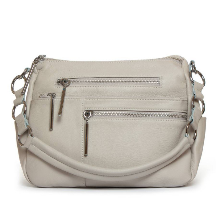 Женская кожаная сумка Alex Rai. Изготовлена из натуральной мягкой кожи. Два отделения, закрываются на молнии. Внутри отделений находятся боковой открытый карман и карман на молнии. Снаружи сумки, на фасаде расположены четыре кармана на молнии и на фасаде один карман. На торцах сумки есть небольшие открытые карманы. Уплотненное дно.
