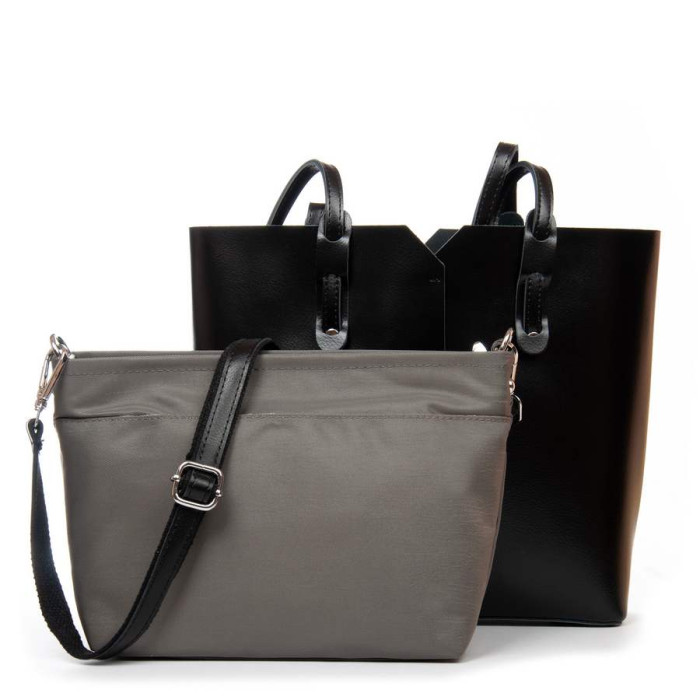 Вовнутрь вложена меньшая сумочка из нейлона, которую можно носить отдельно на плечевом ремне. Сумочка закрывается на молнию. Внутри находится одно отделение с боковым карманом на молнии и открытым карманом. На фасаде расположен большой открытый карман.В комплекте регулируемый плечевой ремень.