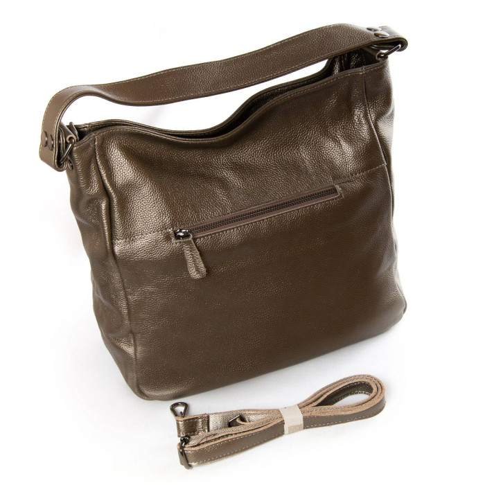 Женская сумка. Изготовлена из натуральной мягкой кожи. Закрывается на молнию. Внутри находится большое отделение, открытый карман и боковой карман на молнии. На обратной стороне находится карман на молнии. В комплекте регулируемый плечевой ремень.
