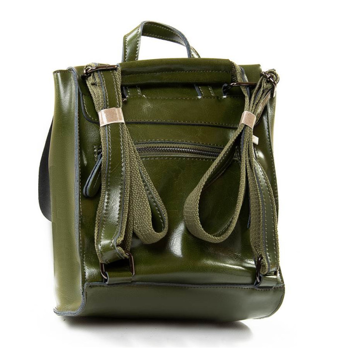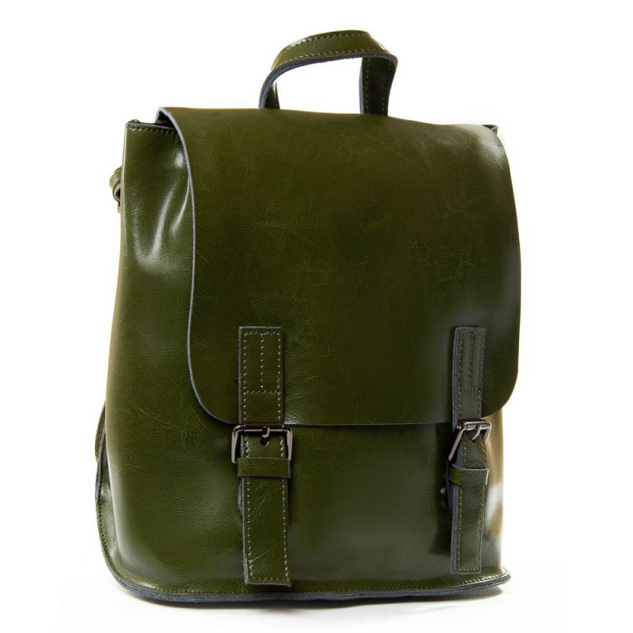 Женский кожаный рюкзак. Изготовлен из натуральной плотной кожи. Можно носить на плече на регулируемом ремне. Под клапаном дополнительно закрывается на молнию. Внутри находится основное и дополнительное отделение, разделенное карманом-перегородкой на молнии, двойной открытый карман и карман на молнии. Снаружи рюкзака на обратной стороне расположен карман на молнии. Плечевые лямки регулируются по длине.