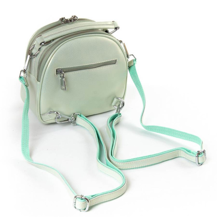 Женская кожаная сумочка-рюкзак. Изготовлена из плотной натуральной кожи. Можно носить как рюкзак или на плече на регулируемом ремне. Два отделения, закрываются на молнию. Внутри отделений есть двойной открытый карман и карман на молнии. На фасаде и обратной стороне находятся карманы на молнии. Плечевые лямки регулируются по длине.
