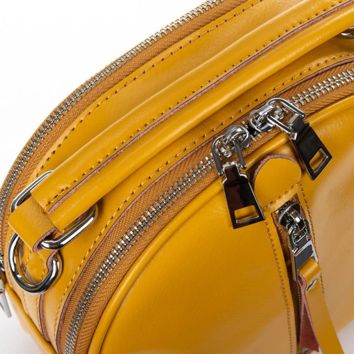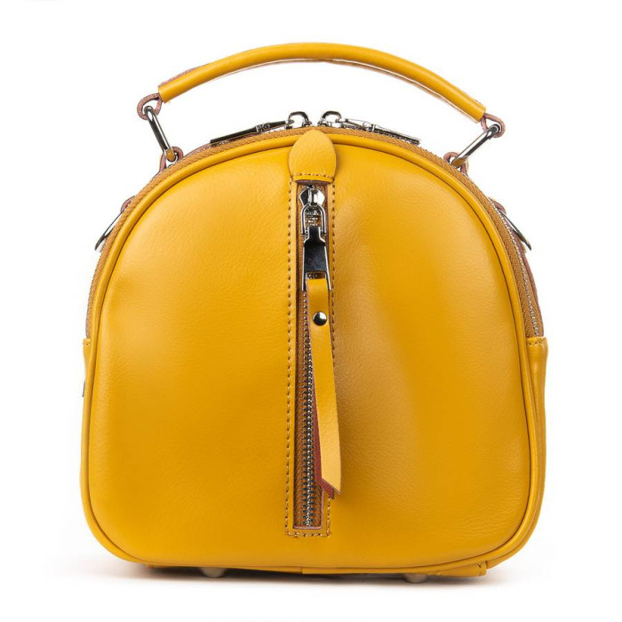 Женская кожаная сумочка-рюкзак. Изготовлена из плотной натуральной кожи. Можно носить как рюкзак или на плече на регулируемом ремне. Два отделения, закрываются на молнию. Внутри отделений есть двойной открытый карман и карман на молнии. На фасаде и обратной стороне находятся карманы на молнии. Плечевые лямки регулируются по длине.