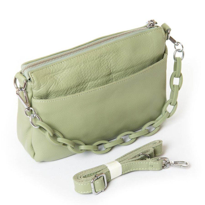 Женская сумочка. Изготовлена из натуральной мягкой кожи. Закрывается на молнию. Внутри находится двойное отделение, разделенное карманом-перегородкой на молнии, открытый карман и боковой карман на молнии. На фасаде и обратной стороне сумки есть карманы на молнии. В комплекте регулируемый плечевой ремень и сьемная ручка.