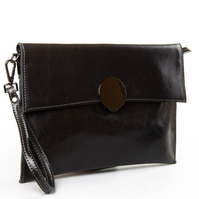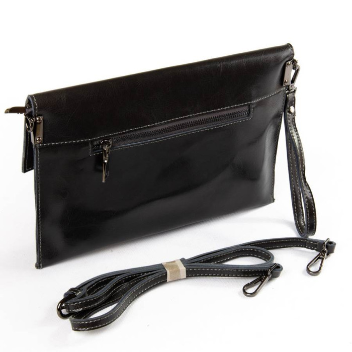 Женская сумка-клатч. Изготовлена из натуральной плотной кожи. Закрывается на замок. Внутри находится двойное отделение, разделенное карманом-перегородкой на молнии, открытый карман и карман на молнии на внутренних стенках сумки. На обратной стороне расположен карман на молнии. В комплекте ремешек для кисти и регулируемый плечевой ремень.