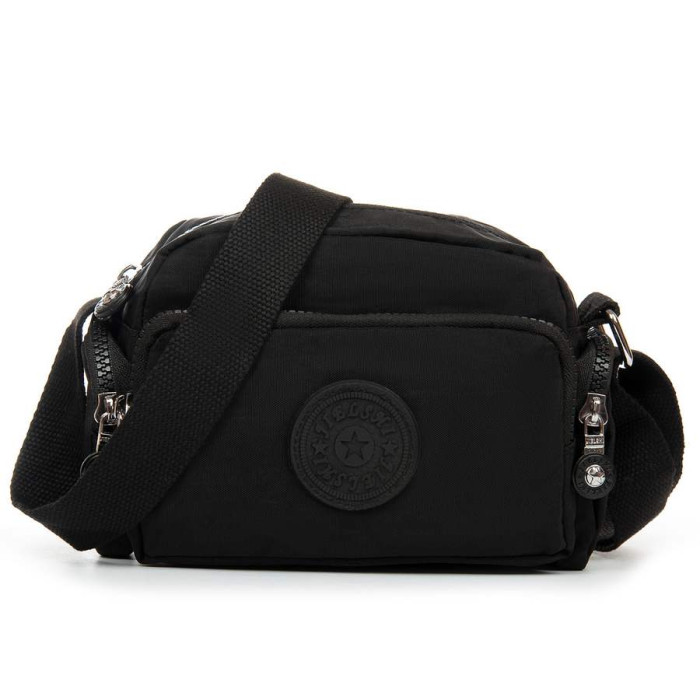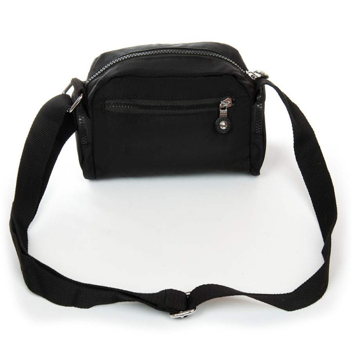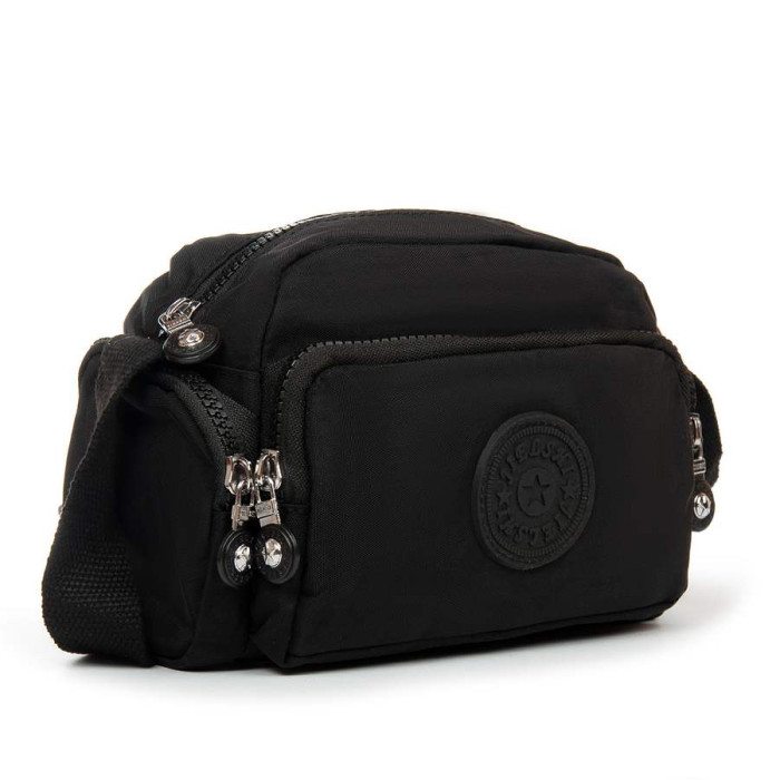 Женская сумочка кросс боди. Изготовлена из водотталкивающего текстиля. Одно отделение, закрывается на молнию. Внутри есть боковой карман на молнии и открытый карман. На фасаде и на обратной стороне находятся вместительные карманы на молнии. А на торцах расположены маленькие кармашки на молнии