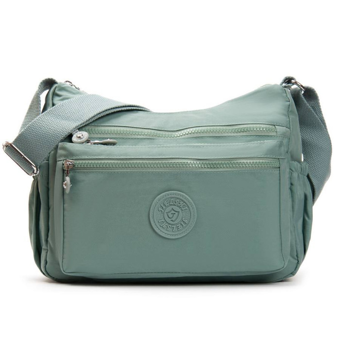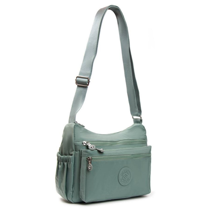 Женская сумка кросс боди. Изготовлена из водоотталкивающего текстиля. Двойное отделение, закрывается на молнию. Внутри есть карман-перегородка на молнии, боковой карман на молнии и открытый двойной карман. На фасаде расположены три больших кармана на молнии, а на обратной стороне находится один вместительный карман на молнии. На торцах сумочки есть небольшие карманы на резинке.