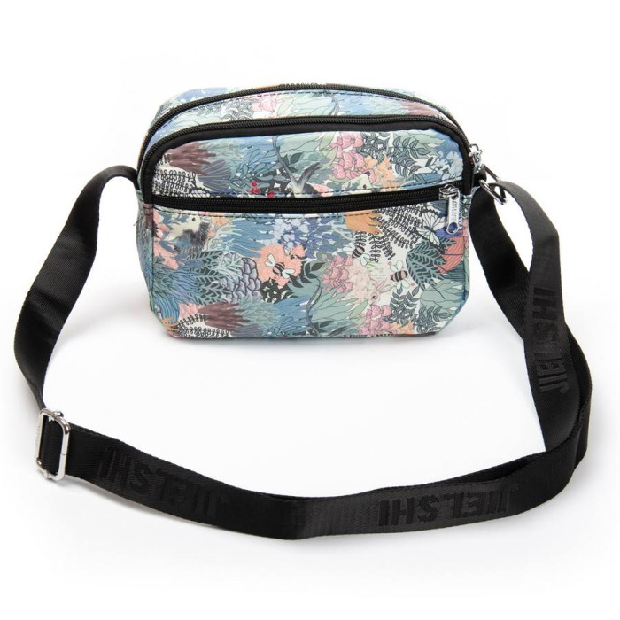 Женская сумочка кросс боди Jielshi. Изготовлена из водотталкивающего текстиля. Два отделения, закрываются на молнии. Внутри есть боковой карман на молнии. На фасаде и на обратной стороне находятся вместительные карманы на молнии.