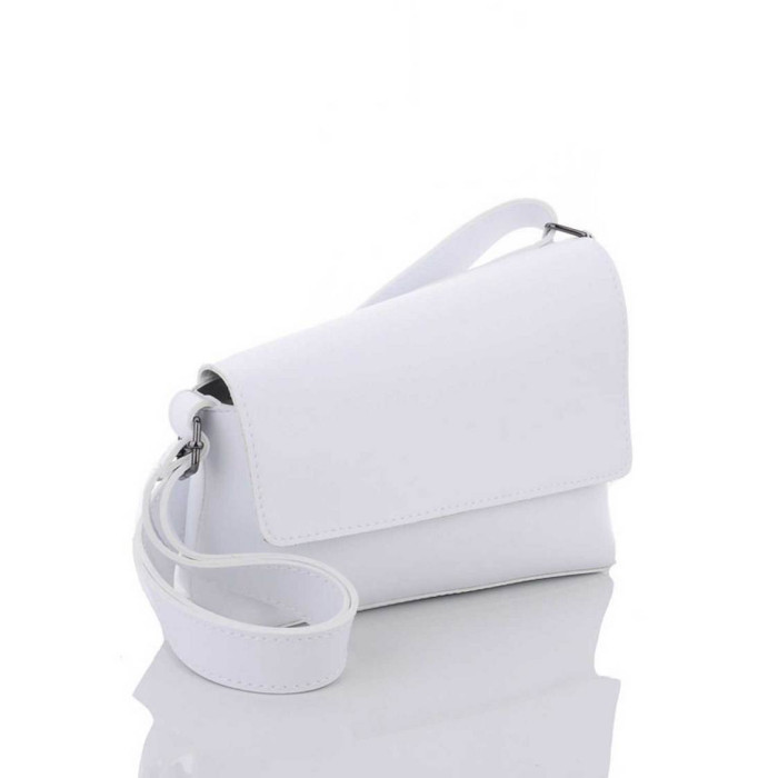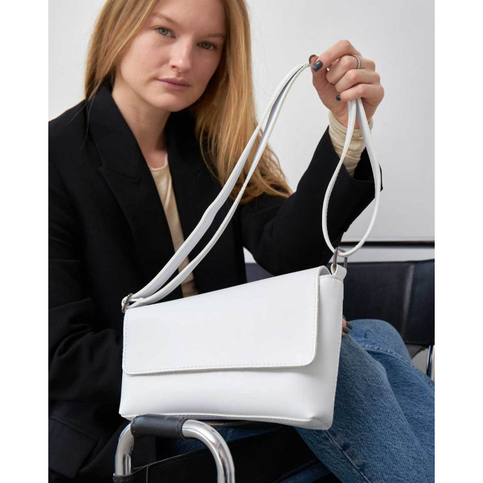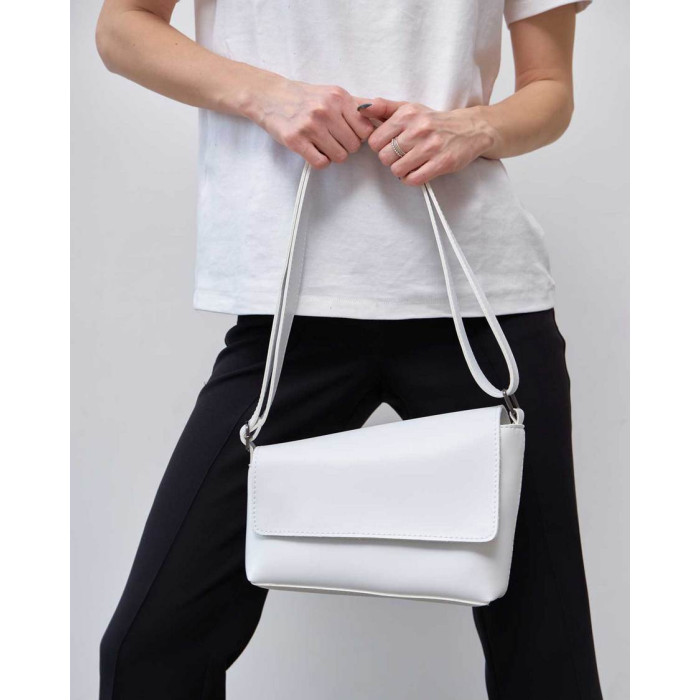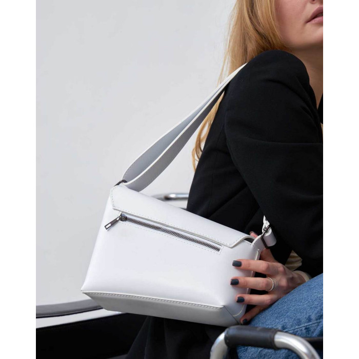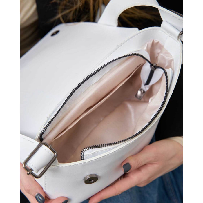 Женская сумка 68700 цвет белый, из экокожи высокого качества (материал похож на кожу). Модель асиметричной формы. Сумка открывается при помощи магнитов и молнии. Внутри на подкладке, имеет открытый карман. Снаружи есть карман для мелких предметов. Плечевой ремень, шириной 3 см., регулируется под разную длину, максимальная длина плечевого ремня 115 см.