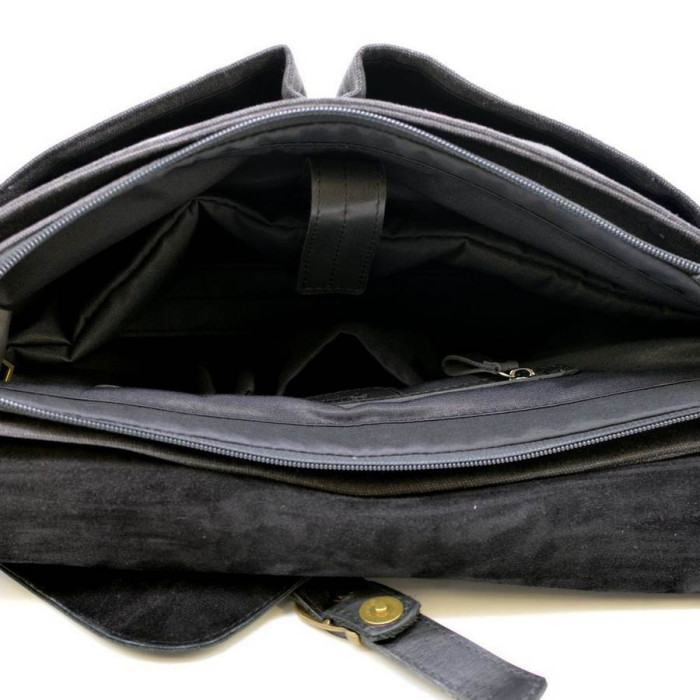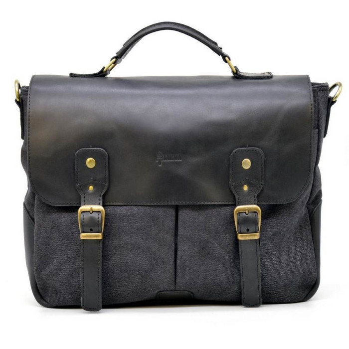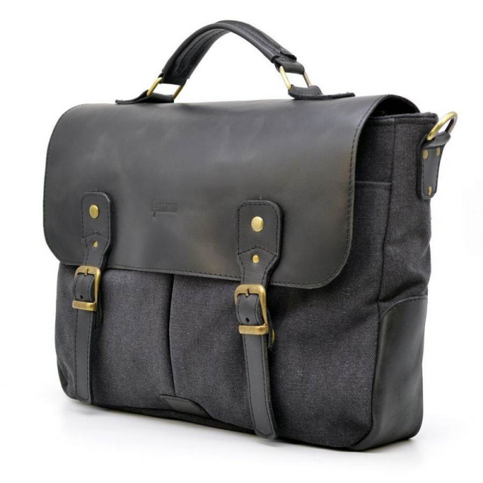 Мужская сумка-портель из лошадиной кожи и ткани canvas TARWA AG-3960-3md. Изделия из серии black-in-black - черный канвас в сочетании с черной кожей на клапанае, ручке, дне и углах с выраженным естественным рисунком кожи (винтажный эффект pull-up). Внутри отделение для ноутбука, карманы.ПОЛНОСТЬЮ кожаный ремень в комплекте.