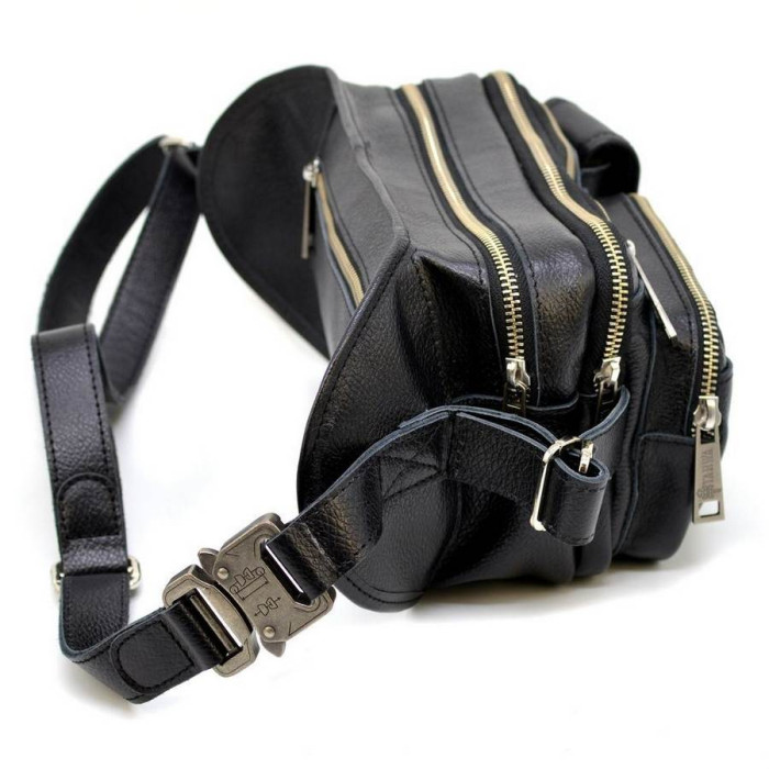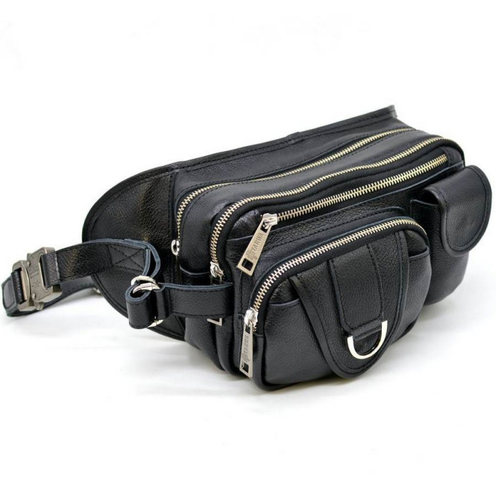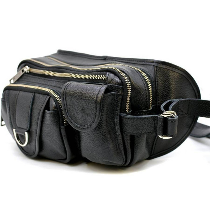 Самая вместительная напоясная сумка из телячьей кожи FA-1560-4lx бренда TARWA может быть полезна в дальних поездках, командировках. Изготовлена из зернистой кожи флотар черного цвета. Имеет четыре изолированных секции на металлических молниях, три из них на лицевой видимой стороне и одна на тыльной стороне (секретная секция). С лицевой части сумки украшают два накладных кармана - один на молнии, второй с клапаном на магнитной кнопке. Кожаный ремень изготовлен полностью из кожи, с широкой регулировкой обхвата. Имеются боковые ремни, регулирующие объем аксессуара. Металлическая серебряная фурнитура прочная и надежная. Подкладка из прочного текстиля.