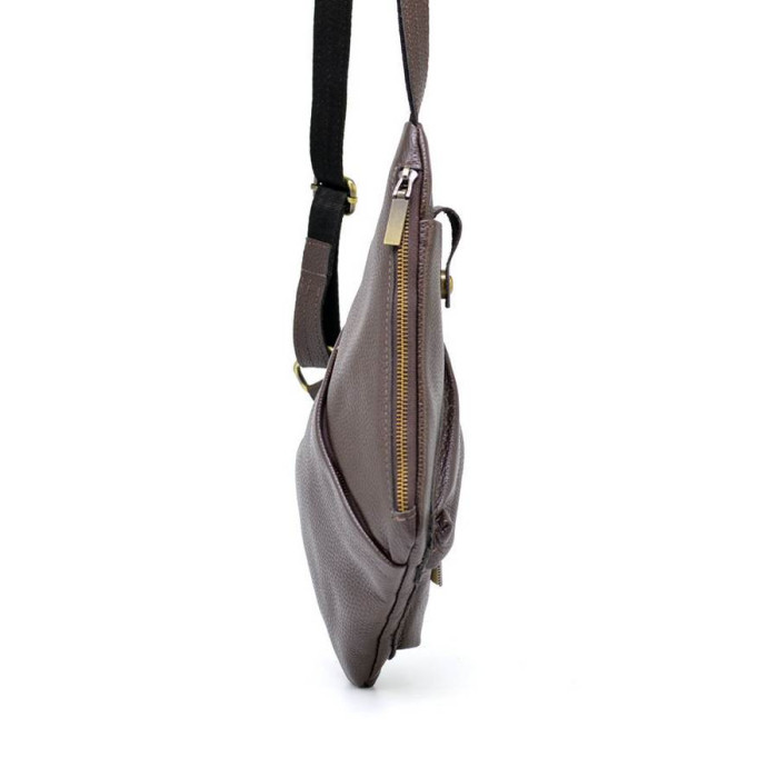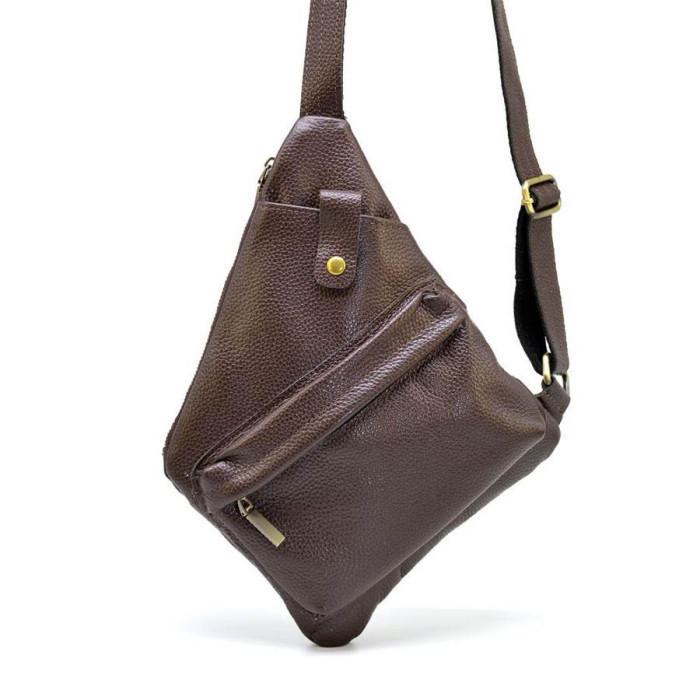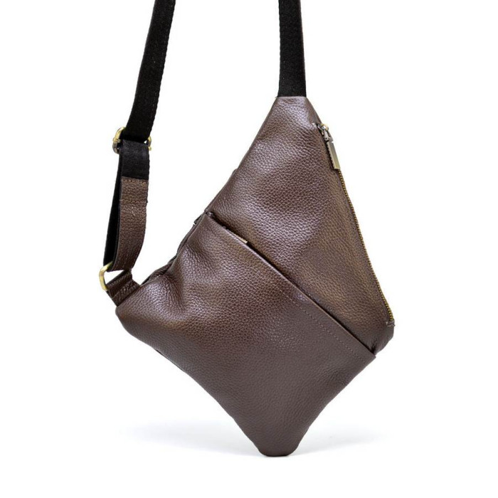 Нагрудная мужская сумка слинг или рюкзак через плечо FC-6501-3md бренд TARWA. Слинг практичной формы и максимальной функциональностью при носке. Будет полезный в поездках и путешествиях. Изделие изготовлено полностью из натуральной телячьей кожи, коричневая кожа флотар. Молнии - антик.