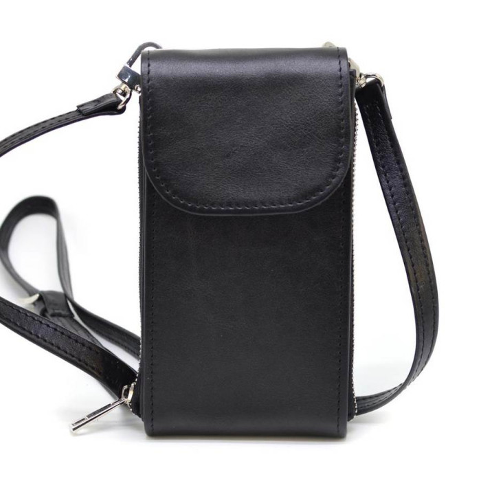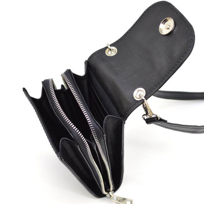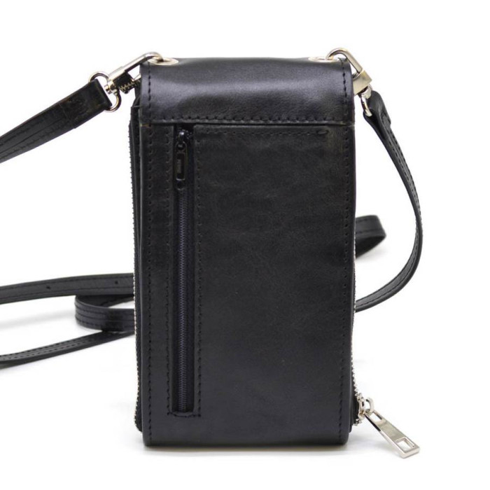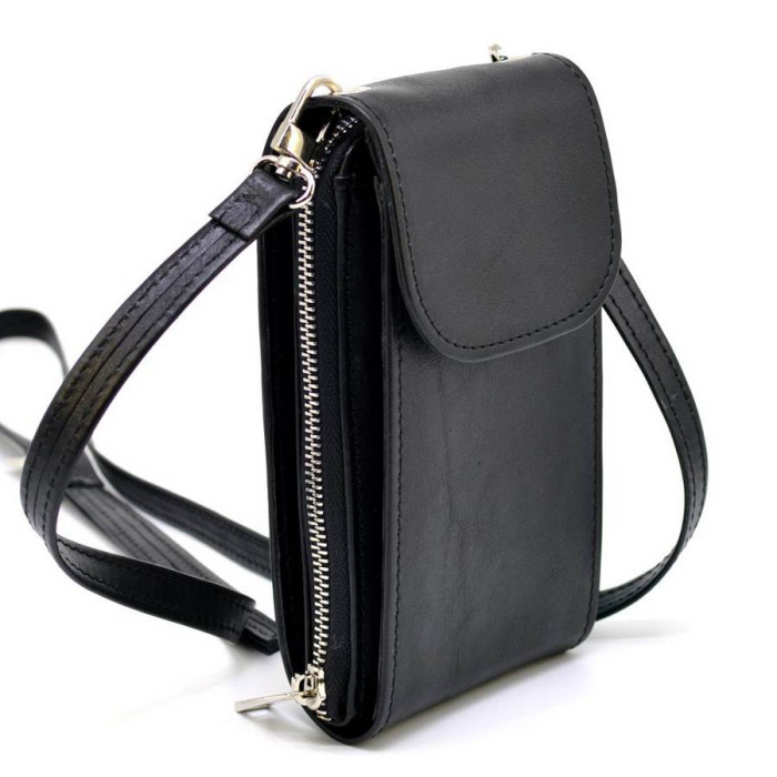 Очаровательная женская сумка-чехол для смартфона GA-2123-4lx от TARWA, из натуральной кожи чёрного цвета с тиснением под рептилию. Производитель - украинский бренд TARWA. Универсальная модель, подойдёт для поездок, прогулок, чтобы надежно хранить Ваши вещи. Такая крошка с легкостью разместит в себе все необходимое: ключи, телефон, помаду, несколько банковских карт и деньги. Аксессуар очень удобен удобен в использовании, так как освобождает руки, не сковывая движения. Сумка-чехол состоит с трех отделений, которые сверху накрываются клапаном. В центральном отделении присутствует еще и застежка на молнию. В одном из отделений расположены четыре слота под карточки. На задней стороне присутствует врезной карман на молнии для мелочи. В изделии использована качественная фурнитура, в серебряном цвете. Ремешок регулируется по длине.