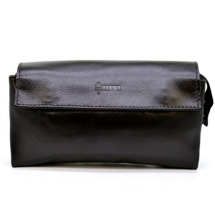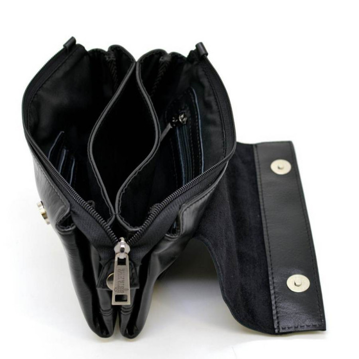 Клатч мужской из натуральной телячьей кожи черного цвета GA-2801-3md, от украинского бренда Tarwa. Красивое изделие на три отделения. Внутри в одном из отделений, имеется врезной карман. В другом, два слота под пластиковые карты или визитки, в виде кожаного кармашка. Между этими отделениями располагается плоский маленький отдел. Клатч застегивается на общую молнию и сверху накрывается кожаным клапаном на магнитные кнопки. На задней стороне сумки есть кожаная плоская ручка-держатель. Аксессуар выглядит стильно и дорого. Его можно носить не только в повседневной носке, но и на какие-либо мероприятия, под костюм.