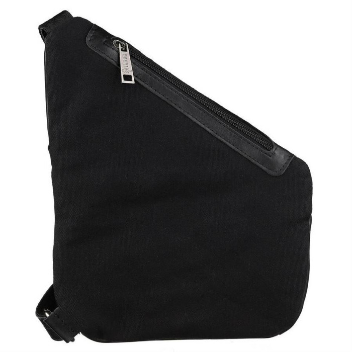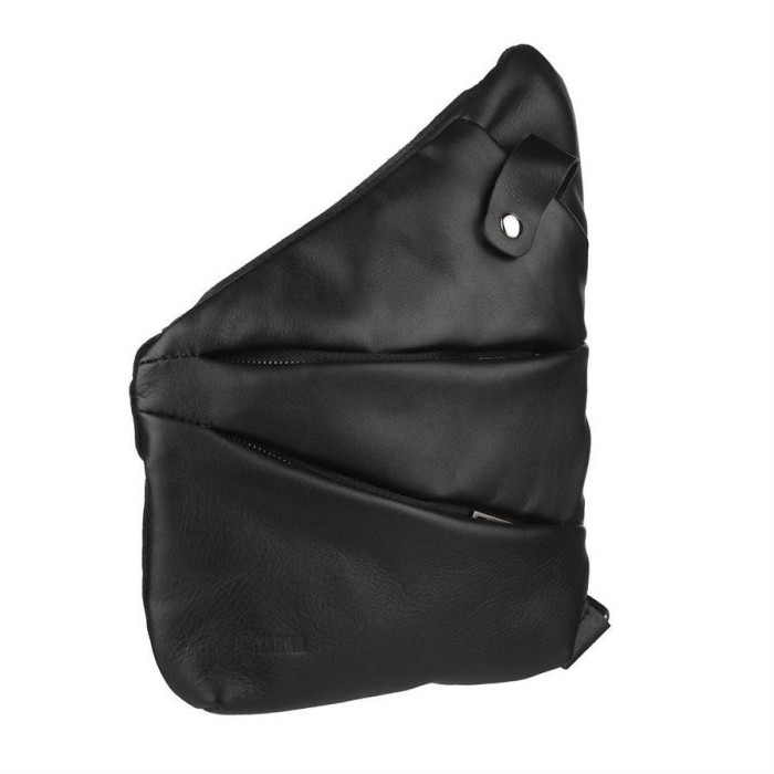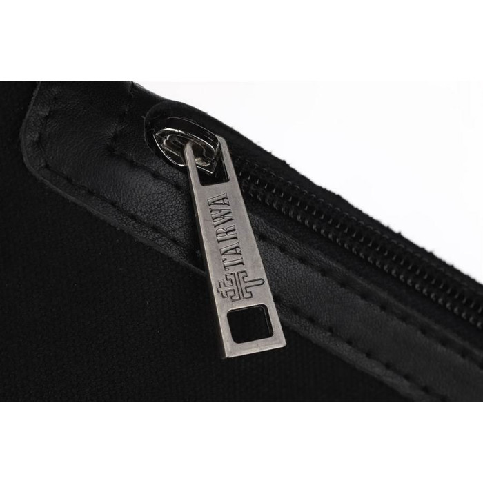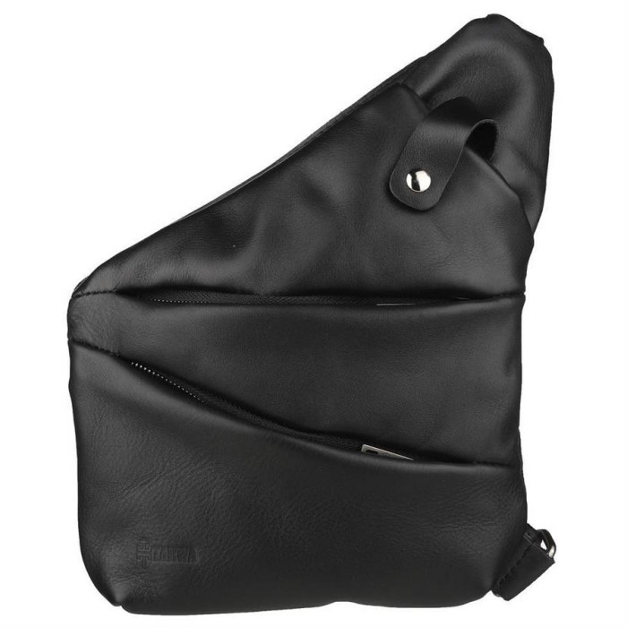 Мужская сумка-слинг через плечо микс канваса и натуральной телячьей кожи, цвет черный GAc-6402-3md, от украинского бренда Tarwa. Задняя часть сумки полностью тканевая, а лицевая сторона наоборот вся из кожи наппа. Изделие отличается оригинальным дизайном и максимальной функциональностью при носке. Будет полезна в поездках и путешествиях. Состоит из одного вместительного отделения, застегивающегося на молнию. На лицевой стороне сумки расположены два горизонтальных кармана, закрывающиеся на молнии, также сверху есть маленький кармашек с хлястиком на кнопке. Ремень (шлейка) двухкомпонентный - состоит из кожи и тектильной стропы для придания прочности и долговечности изделию. Ремень регулируется по длине. Вся фурнитура и молнии металлические.