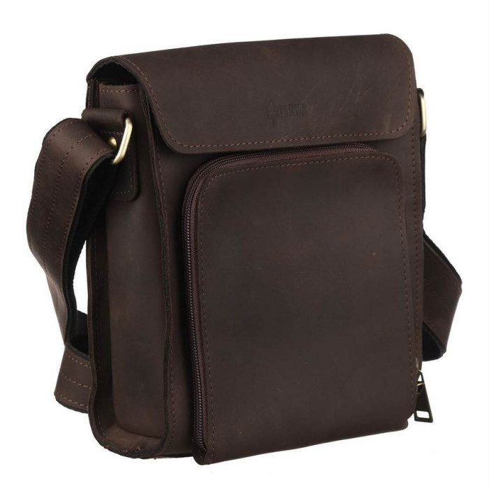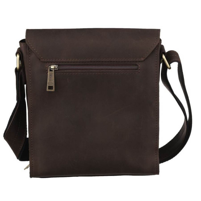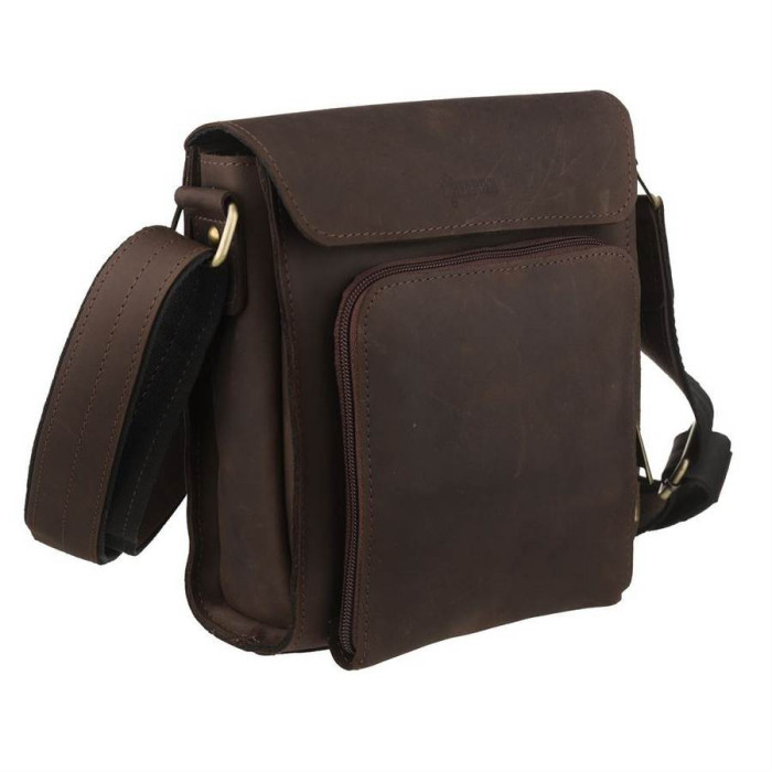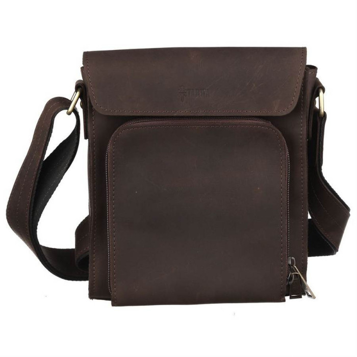 Удобная мужская сумка через плечо, с маленьким клапаном RC-30272-3md бренда TARWA, из натуральной матовой кожи коричневого цвета, выделки crazy horse. Изделие состоит из одного отделения, внутри которого имеется карман на молнии для личных документов и еще один накладной открытый карман для телефона, например. Сумка застегивается на молнию и сверху накрывается клапаном с магнитной кнопкой. На лицевой стороне присутствует гравировка с логотипом производителя. Под клапаном располагается практичный, откидной, вместительный карман на молнии с внутренними кожаными отсеками, для пластиковых карт. На задней стороне изделия находится еще один карман на молнии. Сумка наделена кожаным, регулирующимся по длине ремешком с текстильной основой, предохраняющей от растяжения.