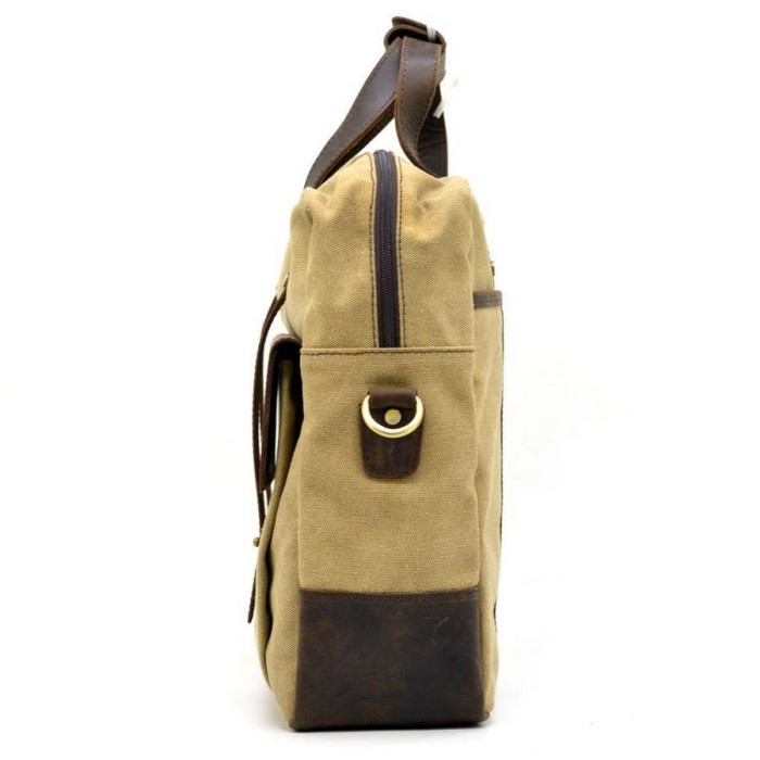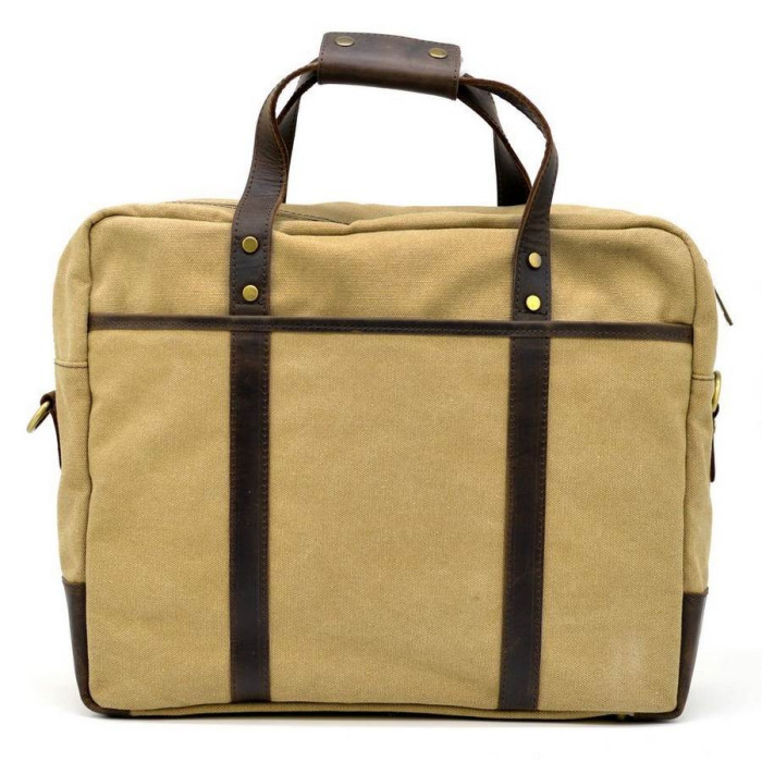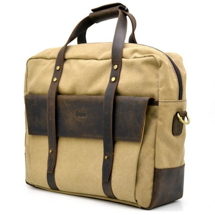 Сумка для ноутбука RC-3942-4lx TARWA изготовлена из текстиля Canvas и натуральной лошадиной кожи. Удобный и вместительный вариант на каждый день, для коротких командировок и поездок. Имеет одно основное отделение, в котором разместились 2 больших кармана, сверху на липучке: один можно использовать для ноутбука, второй для бумаг и документов. Аксессуар помещает лептоп 15 дюймов. Закрывается на молнию с двумя бегунками. Для удобства ношения имеет 2 ручки, и также регулируемый плечевой ремень с кожаным наплечником. С лицевой части украшает изделие карман по размеру сумки, закрывается кожаным клапаном. Фиксируется двумя кожаными ремешками на маленьких штыречках. С внутренней части также есть большой карман на молнии. Прочный и красивый подклад, подобраный к дизайну изделия. На внешнем кармане нанесен логотип бренда.