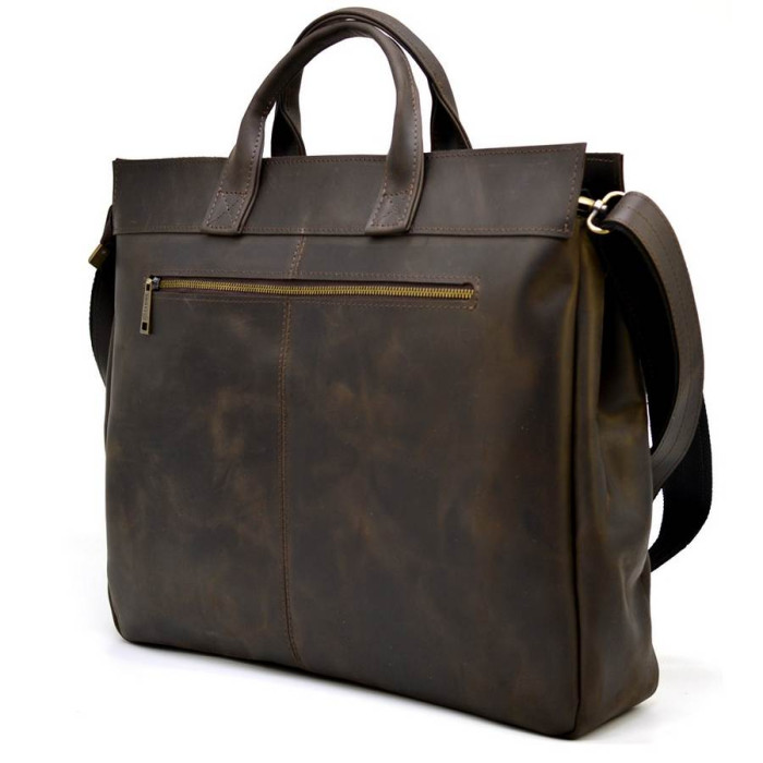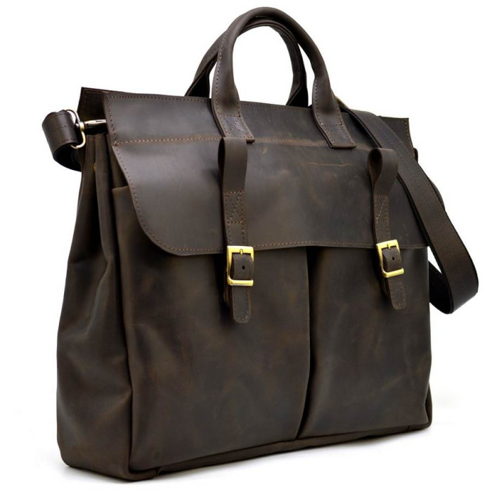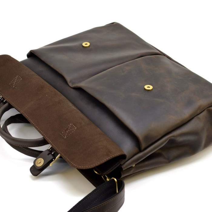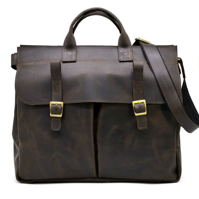 Большая сумка из натуральной телячьей кожи, для ноутбука 17 дюймов RC-7107-extra, от украинского бренда TARWA. Это увеличенная версия, всем полюбившейся, классической модели 7107. Изделие имеет одно большое отделение, внутри которого располагается мягкий отсек для переноса ноутбука 17". Также, внутри имеется открытый карман, держатель для двух ручек и врезной вместительный карман. Сумка застегивается на молнию. Лицевую сторону аксессуара дополняют два объемных кармана, которые прикрывает кожаный клапан с ремешками и фиксируется усиленными магнитными кнопками. На задней стороне изделия есть врезной карман с молнией. Сумка оснащена двумя кожаными ручками для удобной носки в руке, а также кожаным регулируемым по длине ремнем на плечо. Красивый и стильный аксессуар для делового мужчины, хотя прекрасной половине тоже нравится такая модель.