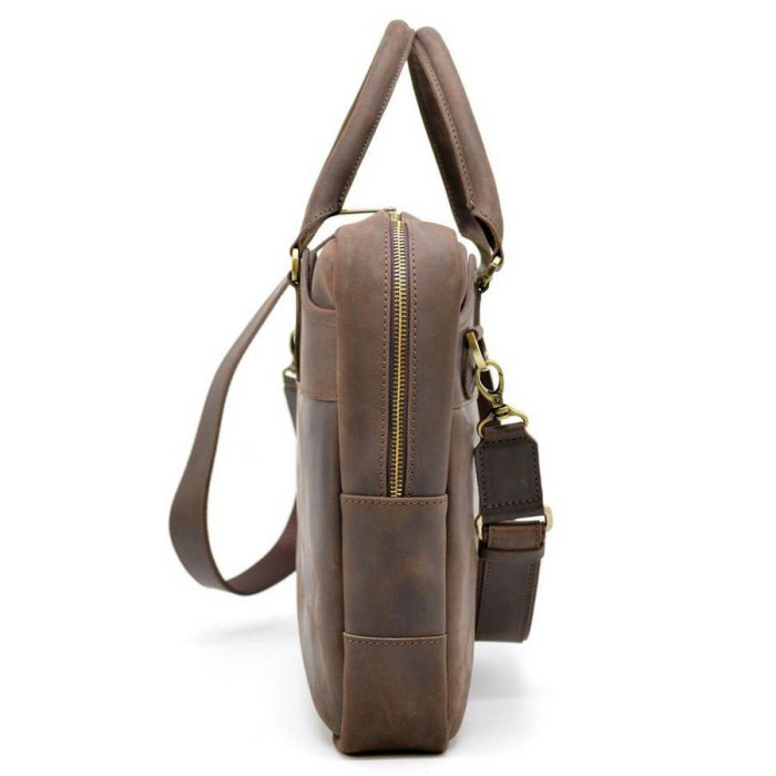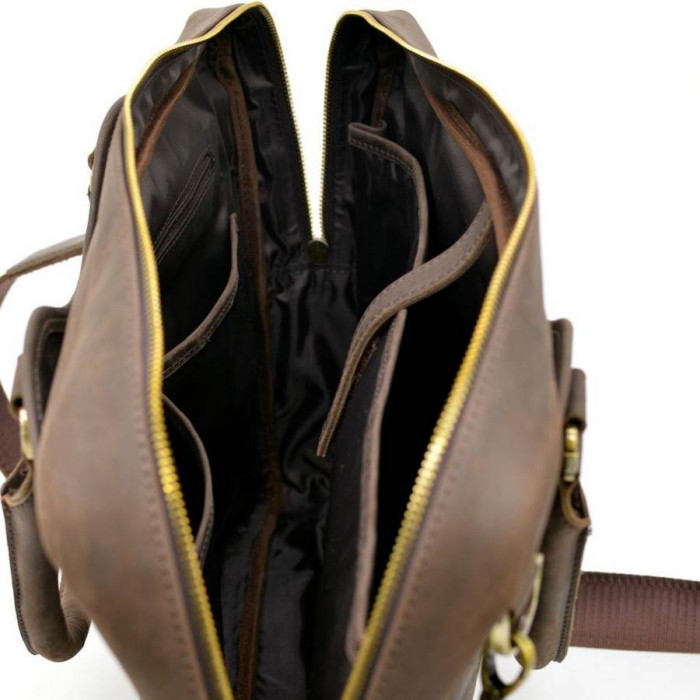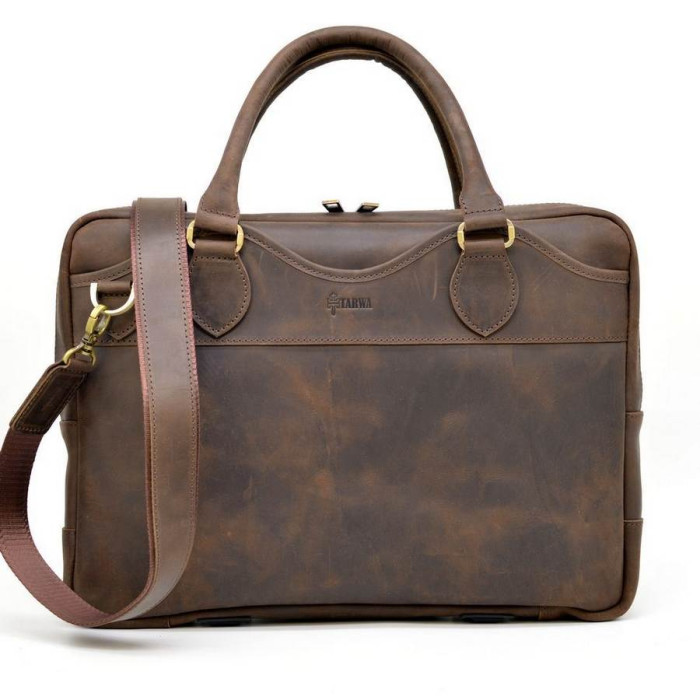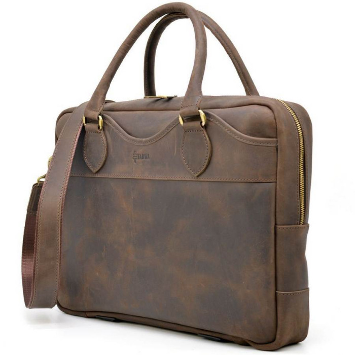 Деловая мужская сумка из натуральной кожи Crazy Horse RС-8839-4lx, от украинского бренда TARWA. Изделие имеет одно основное отделение, внутри которого есть уплотненный отсек с хлястиком на липучке для ноутбука до 15" или документов А4. Также, внутри Вы найдете большой врезной карман с молнией. Сумка застегивается на молнию с двумя бегунками, что очень удобно в использовании. По обеим наружным сторонам расположились плоские карманы-отсеки с магнитными кнопками (занимают почти всю площадь изделия). Сумка декорирована кожаными вставками и логотипом бренда. Аксессуар будет удобно носить в руке, благодаря двум кожаным ручкам, а также в комплектацию входит съемный текстильный ремень с кожаным наплечником.