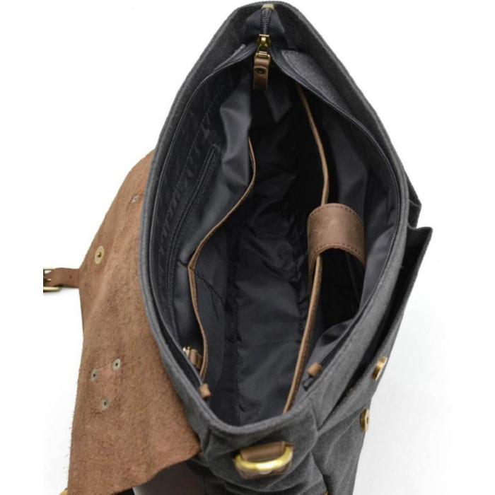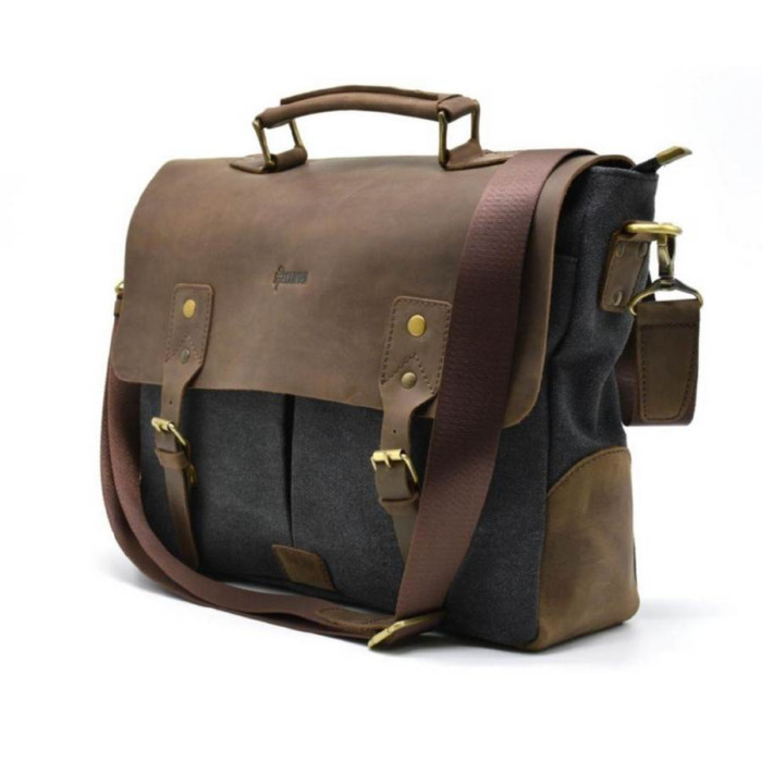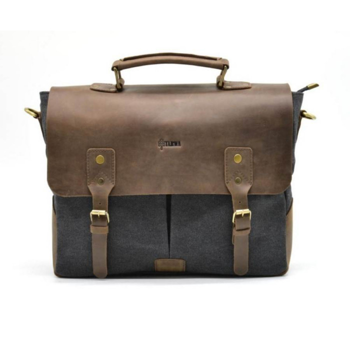 Удобная мужская сумка-портфель кожа+парусина RC-3960-4lx от украинского бренда TARWA. Изделие пошито из очень плотной ткани с кожаными вставками и кожаным клапаном, также сумка имеет маленькую кожаную ручку сверху и ремень через плечо. Внутри качественная тканевая подкладка. Портфель состоит из одного большого отделения, в котором есть специальный отсек на липучке для ноутбука (до 14"). Также имеется большой врезной карман с молнией, и два накладных кармана поменьше для телефона и портмоне. Лицевую сторону украшает кожаный клапан с ремешками и магнитами, который накрывает основное отделение и два накладных кармана, в которых удобно хранить предметы, которые всегда должны быть под рукой. На задней стороне сумки имеется большой плоский карман с магнитами. Аксессуар оснащен съемным текстильным ремнем через плечо, в местах крепления присутствуют кожаные вставки.