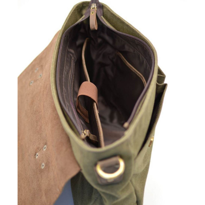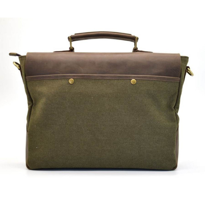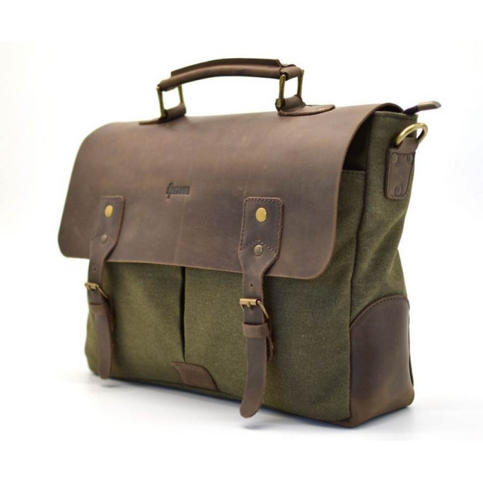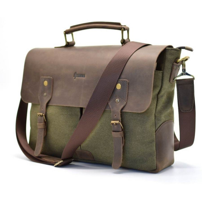 Стильная мужская сумка-портфель из парусины, с кожаным клапаном из лошадиной кожи RH-3960-4lx от украинского бренда TARWA. Изделие выполнено из очень плотной ткани с элементами кожаных вставок и кожаным клапаном, с маленькой кожаной ручкой сверху и ремнем через плечо. Внутри сумка обшита тканевой подкладкой. Портфель состоит из одного вместительного отделения, внутри которого есть специальный отсек на липучке для ноутбука (до 14"). Также имеется большой врезной карман, застегивающийся на молнию, и два накладных кармана поменьше для телефона и портмоне. На лицевой стороне есть два накладных кармана, которые прикрывает кожаный клапан с ремешками и магнитными кнопками. На задней стороне сумки располагается большой плоский карман с магнитами. Аксессуар оснащен съемным текстильным ремнем через плечо, в местах крепления присутствуют кожаные вставки.