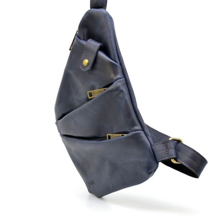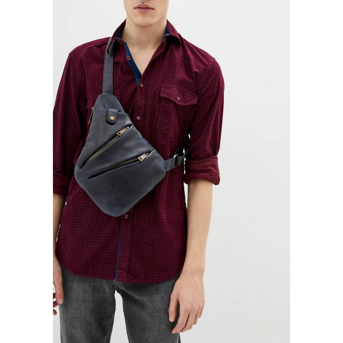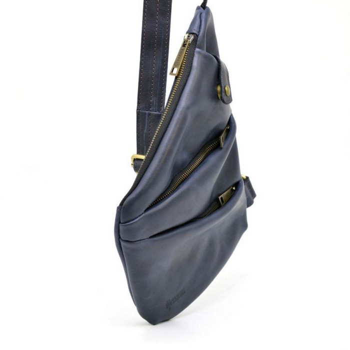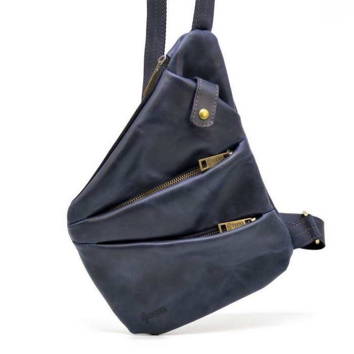 Сумка-слинг на одно плечо RK-6402-3md украинского бренда Tarwa, из натуральной телячьей кожи темно-синего цвета, для мужчин. Изделие с интересным дизайном и максимальной функциональностью при носке. Аксессуар пригодится как в поездках и путешествиях, так и просто на каждый день. Состоит из одного вместительного отделения, застегивающегося на молнию. На лицевой стороне сумки расположены два горизонтальных кармана с молниями, которые служат еще и декором, также сверху есть небольшой карманчик с кнопкой, в который помещается смартфон.