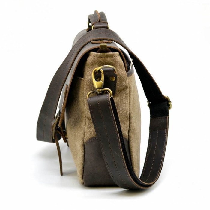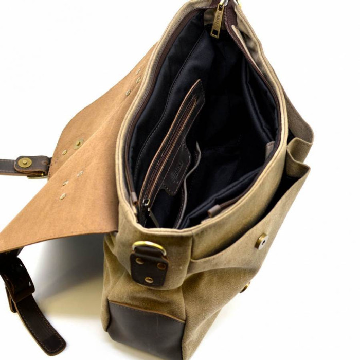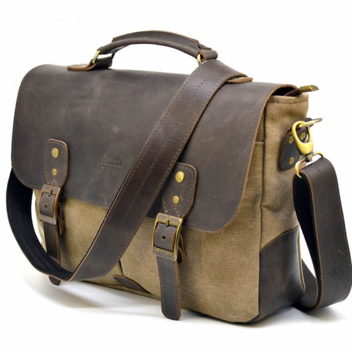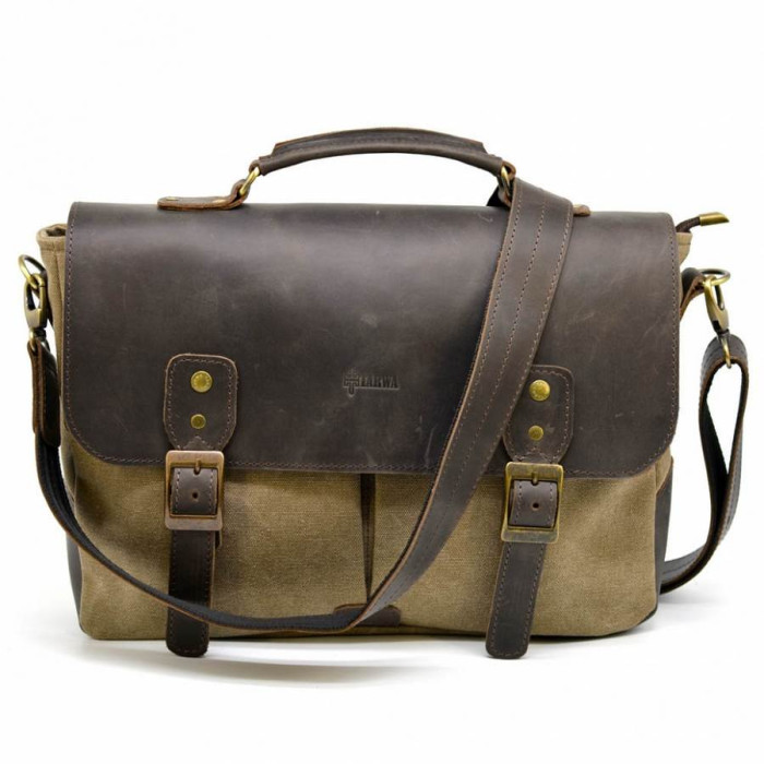 Мужская сумка-портфель, из ткани канвас (парусина) и натуральной лошадиной кожи RSc-3960-3md, от украинского бренда TARWA. Изделие выполнено из очень плотной ткани с элементами кожаных вставок и кожаным клапаном, с маленькой кожаной ручкой сверху и ремнем через плечо. Внутри изделие обшито тканевым подкладом. Портфель на одно отделение, с внутренним мягким отсеком на липучке для ноутбука (до 14"). Также, внутри есть большой врезной карман, застегивающийся на молнию, и два накладных кармана поменьше для телефона и портмоне. На лицевой стороне есть два открытых кармана, которые прикрывает кожаный клапан с фальш-ремешками и магнитными кнопками. На задней стороне сумки располагается большой плоский карман с молнией. Аксессуар оснащен съемным текстильным ремнем через плечо, на котором в местах крепления присутствуют кожаные вставки.