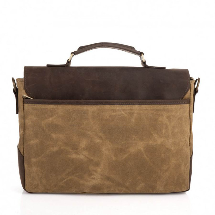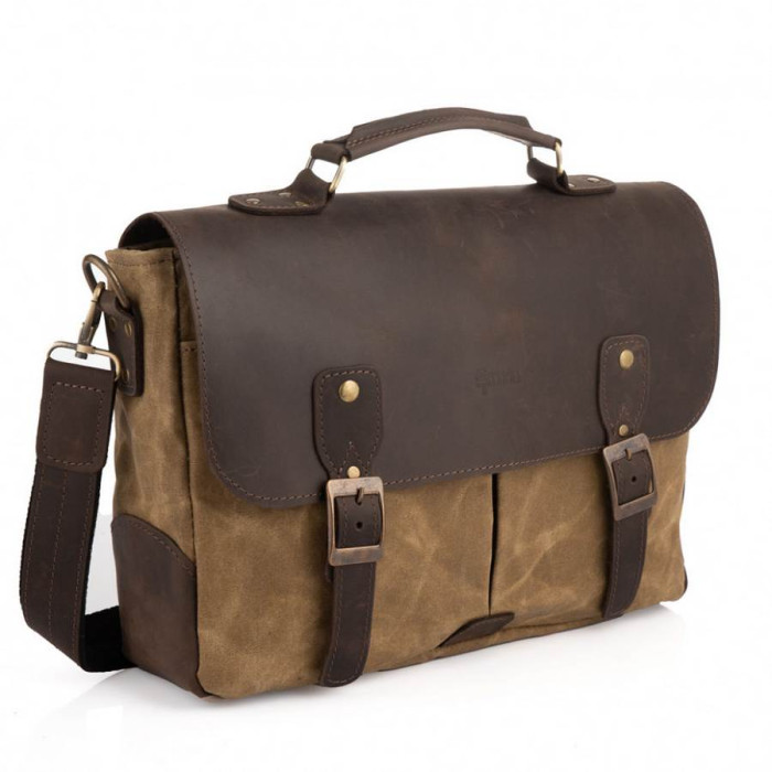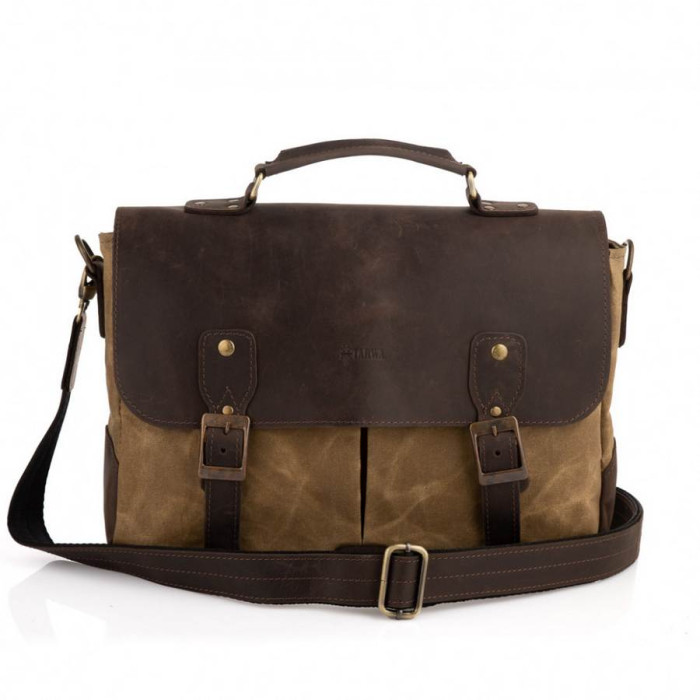 Мужская сумка-портфель, из ткани канвас (парусина) и натуральной лошадиной кожи RSw-3960-3md, от украинского бренда TARWA. Изделие выполнено из очень плотной ткани с элементами кожаных вставок и кожаным клапаном, с маленькой кожаной ручкой сверху и ремнем через плечо. Внутри изделие обшито тканевым подкладом. Портфель на одно отделение, с внутренним мягким отсеком на липучке для ноутбука (до 14"). Также, внутри есть большой врезной карман, застегивающийся на молнию, и два накладных кармана поменьше для телефона и портмоне. На лицевой стороне есть два открытых кармана, которые прикрывает кожаный клапан с фальш-ремешками и магнитными кнопками. На задней стороне сумки располагается большой плоский карман с молнией. Аксессуар оснащен съемным текстильным ремнем через плечо, на котором в местах крепления присутствуют кожаные вставки.