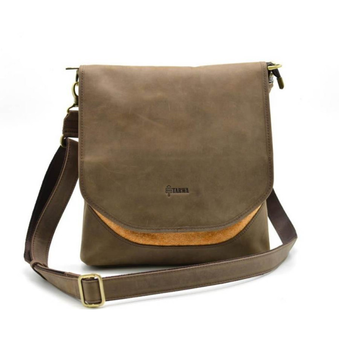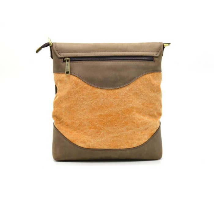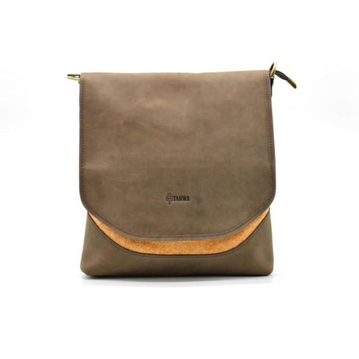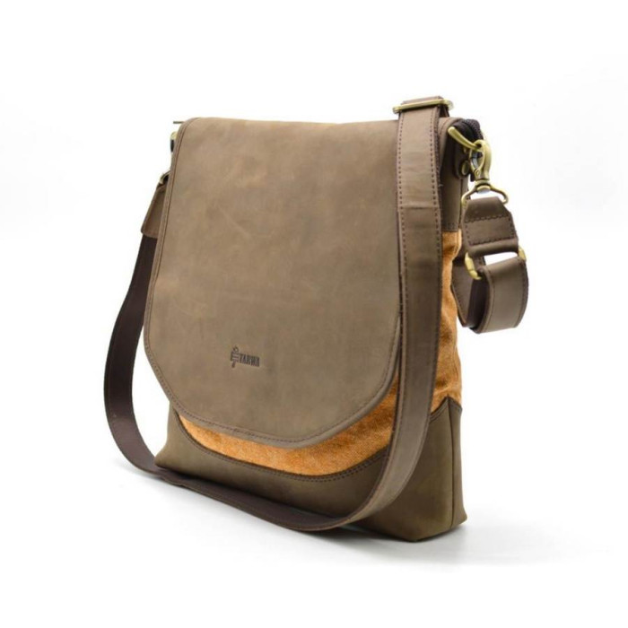 Стильная и яркая модель мужской сумки через плечо кожа+парусина - RY-18072-4lx от украинского бренда TARWA. Идеально подходит для повседневной носки: для работы, учебы и прогулок. Вмещает формат А4, хотя и впритык. Изделие выполнено из высококачественных материалов: плотная ткань парусина или как ее еще называют "Canvas", плюс кожаный клапан и вставки из натуральной телячьей кожи. Сумка имеет один основной отдел, внутри которого располагается уплотненный отсек на липучке, для планшета или документов. Также внутри, на другой стороне, имееются два накладных открытых кармана для телефонов и большой карман на молнии почти на всю поверхность сумки. На задней стороне изделия есть вместительный карман с молнией. Аксессуар застегивается на молнию и сверху накрывается кожаным клапаном со скрытой магнитной кнопкой. Наплечный кожаный регулируемый ремень можно отстегнуть при необходимости. Лицевая сторона сумки имеет гравировку с логотипом.