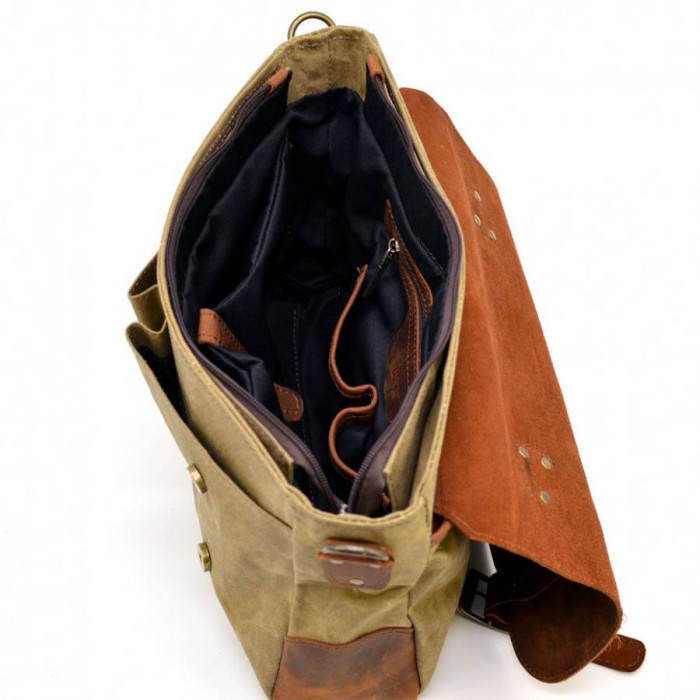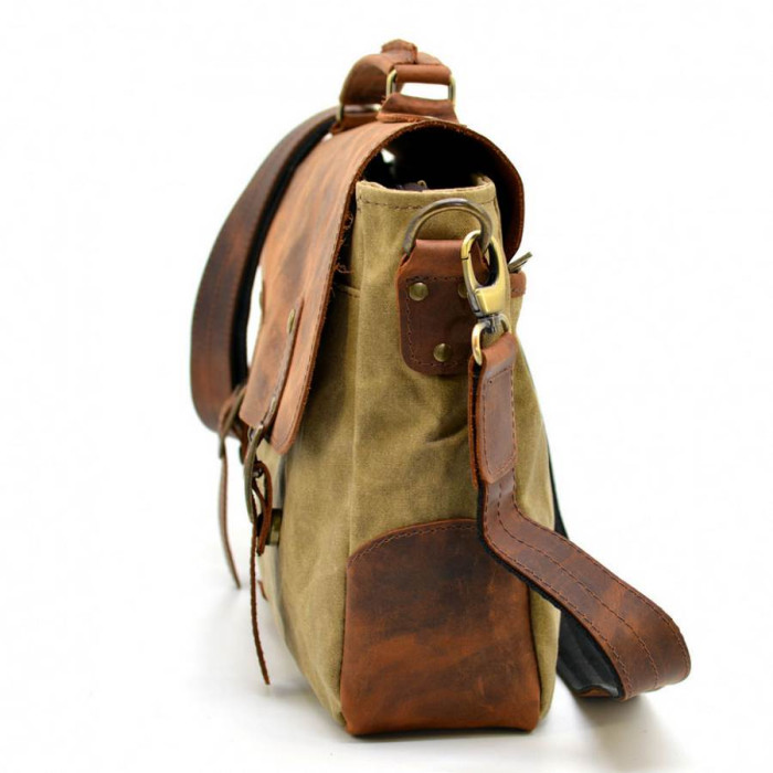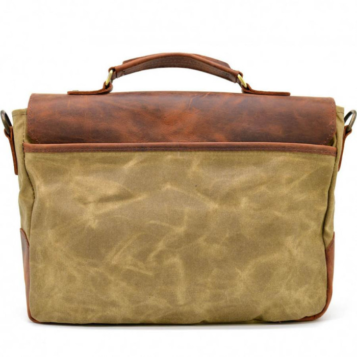 Мужская сумка-портфель, из ткани канвас (парусина) и натуральной лошадиной кожи RSw-3960-3md, от украинского бренда TARWA. Изделие выполнено из очень плотной ткани с элементами кожаных вставок и кожаным клапаном, с маленькой кожаной ручкой сверху и ремнем через плечо. Внутри изделие обшито тканевым подкладом. Портфель на одно отделение, с внутренним мягким отсеком на липучке для ноутбука (до 14"). Также, внутри есть большой врезной карман, застегивающийся на молнию, и два накладных кармана поменьше для телефона и портмоне. На лицевой стороне есть два открытых кармана, которые прикрывает кожаный клапан с фальш-ремешками и магнитными кнопками. На задней стороне сумки располагается большой плоский карман с молнией. Аксессуар оснащен съемным текстильным ремнем через плечо, на котором в местах крепления присутствуют кожаные вставки.
