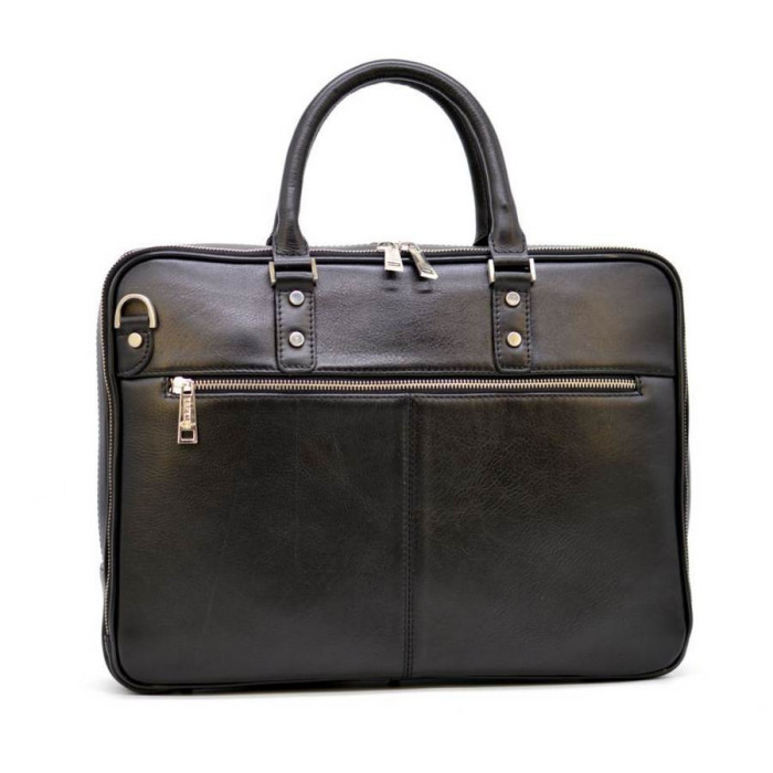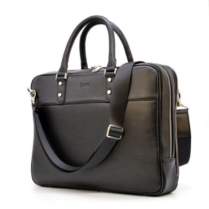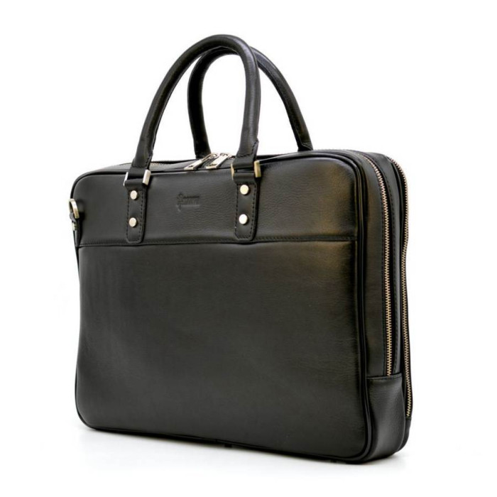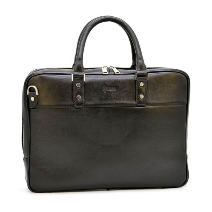 Красивая деловая мужская сумка-портфель из натуральной телячьей кожи TA-4766-4lx TARWA. Отличный вариант для работы или учебы. Вмещает ноутбук до 16", документы А4, и многое другое. Сумка имеет две маленькие ручки для переноса в руке и съемный кожаный ремень на плечо. Изделие состоит из двух отделений, в одном из которых располагается уплотненный отсек, застегивающийся на хлястик с липучкой, для хранения ноутбука или документов. Также, внутри есть большой врезной карман с молнией для ценных вещей и три вместительных открытых кармана для смартфона, портмоне и прочего. На одной из наружных сторон есть врезной карман с молнией. Дно оснащено пятью металлическими ножками. Аксессуар оформлен в сдержаном стиле, без лишних выступающих карманов и ремешков. Для производства сумки была использована качественная фурнитура и плотный текстильный подклад, что располагает к долговечности эксплуатации изделия.