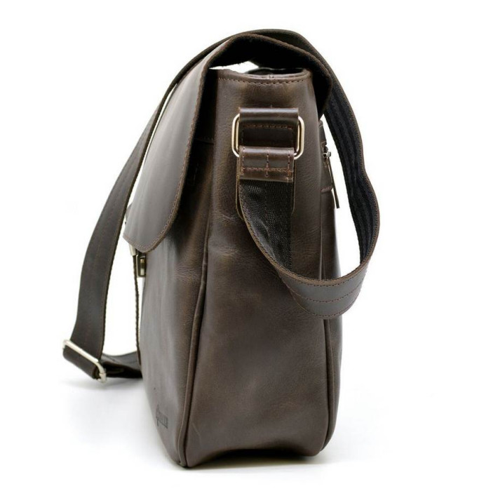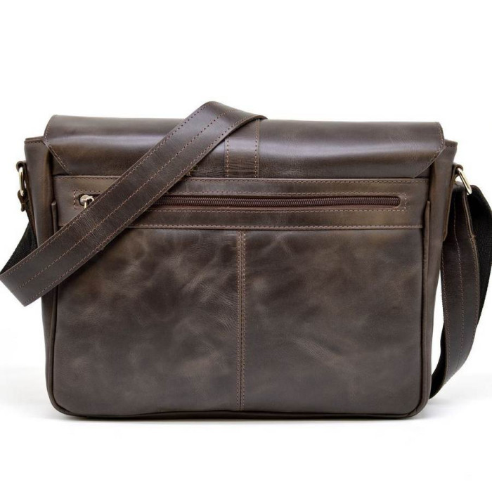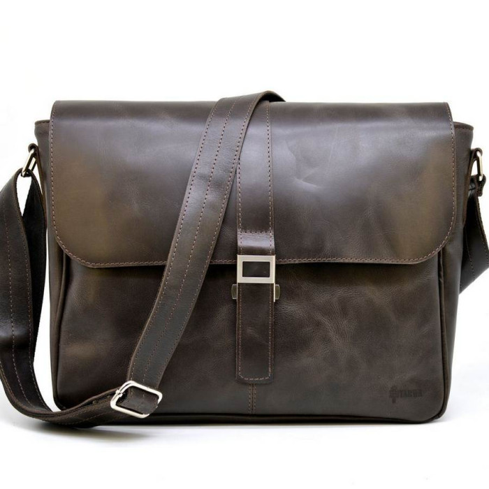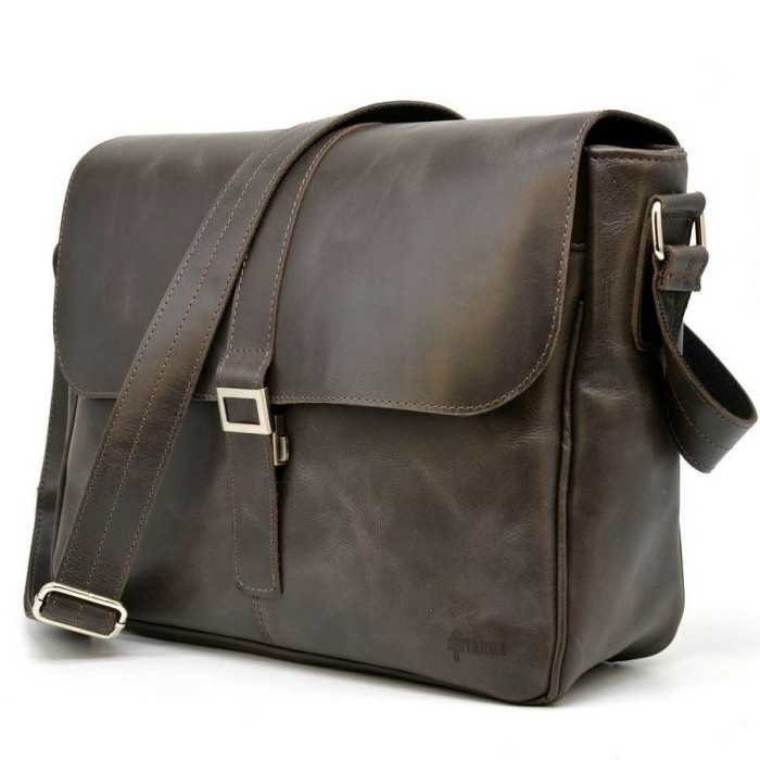 Мужская сумка через плечо из натуральной телячьей кожи TC-1046-4lx от украинского бренда Tarwa. Для переноски ноутбука до 14" или документов формата А4 в основном отделении. Изделие имеет одно отделение, внутри которого располагается мягкий отсек на хлястике с липучкой для маленького ноутбука или планшета. Также есть три кармана: один врезной с молнией, и еще два открытых для смартфона и портмоне. Сумка застегивается на молнию и сверху прикрывается кожаным клапаном с интересной застежкой-защелкой нового образца. Под клапаном имеется врезной большой карман. На задней стороне сумки также врезной карман. На задней стенке изделия внутри есть еще скрытый карман на всю плоскость сумки. Аксессуар наделен кожаным наплечным ремешком для удобства носки, с регулировкой длины.