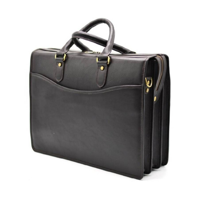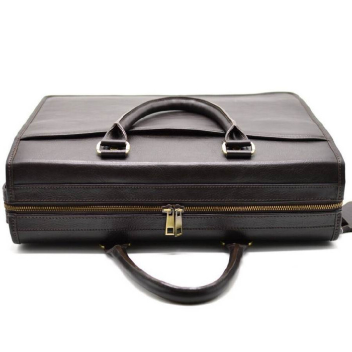 Данная модель выполнена в классическом стиле. В сумке две удобные ручки из натуральной кожи. Материалом служит телячья кожа отменной выделки, плюс качественная текститильная подкладка и металлическая фурнитура. Модель для современных деловых людей. Дополнительный регулируемый наплечный ремень, при необходимости отстегивается. Основной отдел изделия делится на три отсека: объемное уплотненное отделение для ноутбука, расположенное внутри осноного в центре, и закрывающееся на липучку, еще два отсека для бумаг, папок или книг, имеется большой карман на молнии и три кармана для телефона и других небольших предметов. Обе наружные стороны портфеля имеют дополнительный плоский вместительный отдел-карман для вещей, которые всегда должны быть под рукой.