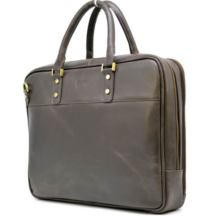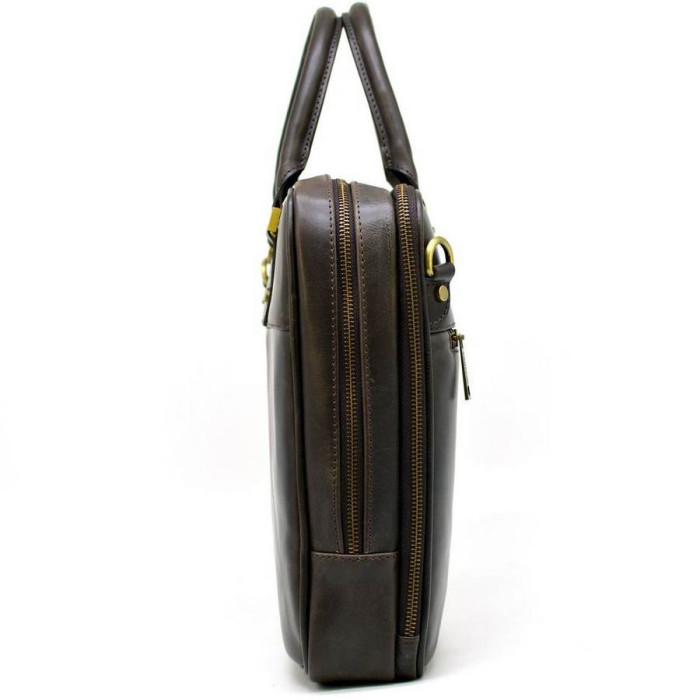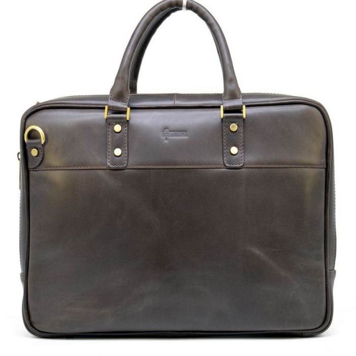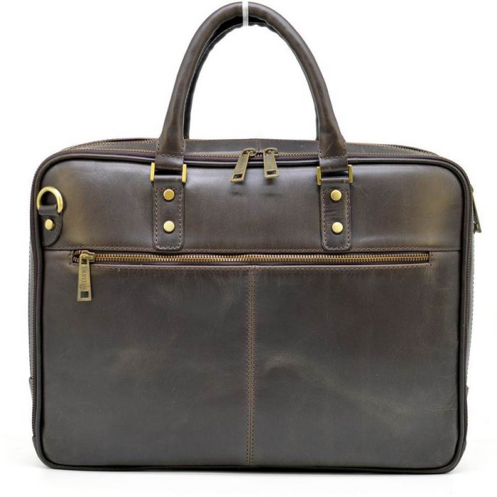 Мужская сумка-портфель из натуральной кожи TС-4766-4lx TARWA изготовлена в благородном коричневом цвете. Отличный вариант для работы или учебы. Помещает ноутбук до 16", документы А4, и многое другое. Сумка имеет две маленькие ручки для переноса в руке и съемный кожаный ремень на плечо. Изделие состоит из двух отделений, в одном из которых располагается уплотненный отсек, застегивающийся на хлястик с липучкой, для хранения ноутбука или документов. Также, внутри есть большой врезной карман с молнией для ценных вещей и три вместительных открытых кармана для смартфона, портмоне и прочего. На одной из наружных сторон есть врезной карман с молнией. Фурнитура сумки - бронза, качественные и долговечные молнии. На дне сумки расположены четыре металлические ножки, что помогает защитить кожу от истирания и царапин.