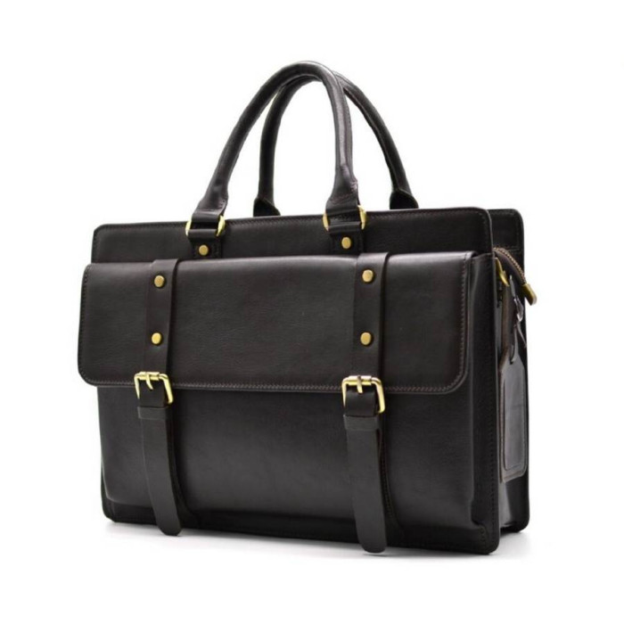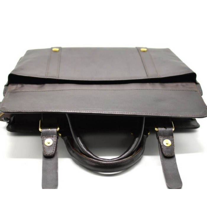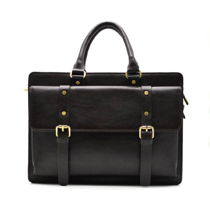 Классическая мужская сумка из натуральной кожи черного цвета для документов и ноутбука. Внутри одно основное отделение, в котором находится специальный карман для бумаг формата А4 или планшета. В основное отделение помещается ноутбук с диагональю экрана до 15.6 дюймов. Также внутри есть три небольших кармана для всяких мелких предметов, например телефон, документы, портмоне. На лицевой стороне изделия располагается большой вместительный карман, закрывающийся клапаном с ремешками и магнитами. На задней стороне сумки есть карман на молнии. Аксессуар оснащен двумя удобными кожаными ручками, а также съемным ремнем через плечо, который можно отрегулировать по длине.