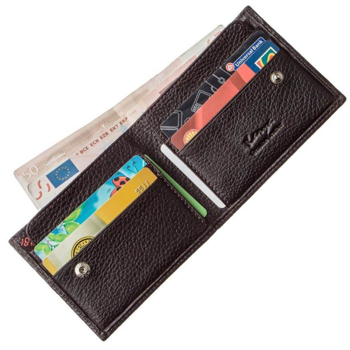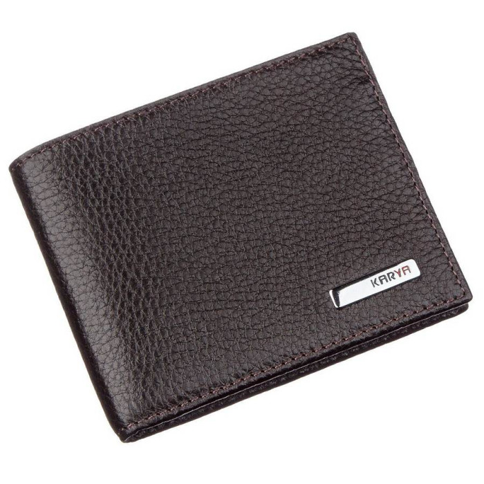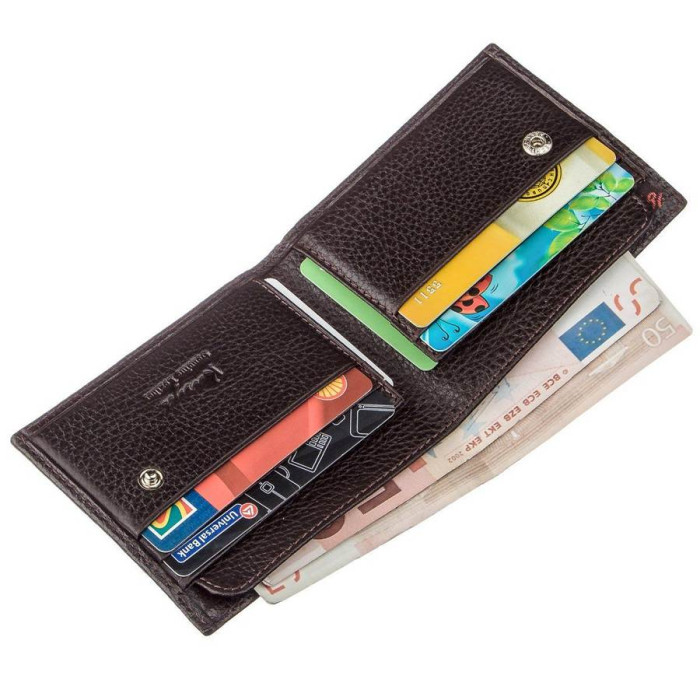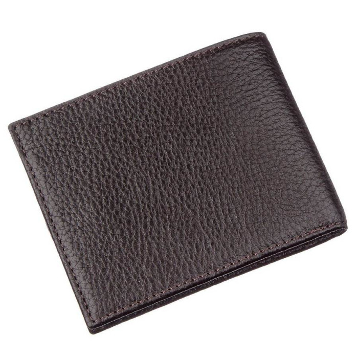 Тонкий кожаный мужской бумажник из натуральной кожи типа флотар коричневого цвета. Коричневый цвет является вторым по популярности среди кожаных аксессуаров. Кожа флотар более практична в носке и на ней менее видны царапины и потертости. Закрывается аксессуар на кнопку. На лицевой стороне металлический логотип бренда. По краям модель прошита ровной коричневой строчкой. В комплекте идет фирменный картонный чехол белого цвета.