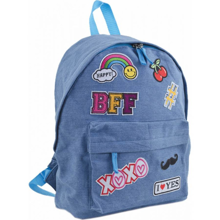 Облегченный джинсовый рюкзак с ярким дизайном и стильными нашивками. Объемный передний карман на молнии. Внутри - дополнительные карманы на молнии для мобильного телефона и мелочей. Двусторонняя молния сверху. Обработанные внутренние швы. Материал: коттон. Размер: 30х36х12.