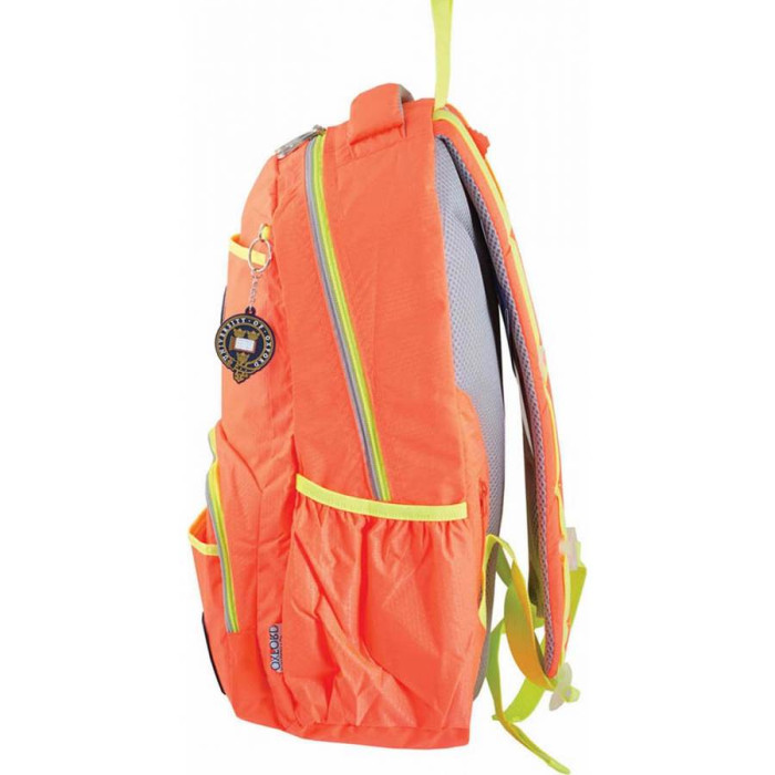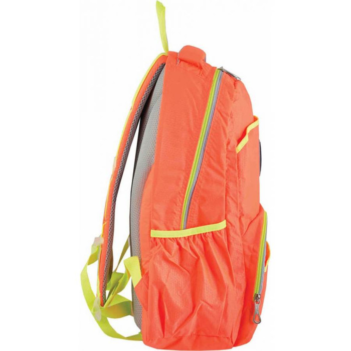 Внутри рюкзака - подвижные разделители с эластичной лентой, карманы на молнии, на липучке, карман для мобильного телефона, внутренний боковой карман. На передней панели - карманы. Два боковых кармана. Плотная спинка с вентилируемой сеткой "Air Mesh" и с карманом на молнии. Две ручки для переноски в руке. Снизу рюкзака - карман с защитным капюшоном. Съемный поперечный ремень со свистком. Брендированная подкладка. Светоотражающие элементы. Материал: облегченный полиэстер. Габариты: 47х31х15 см. Объем (л): 8. Вес: 700 г.