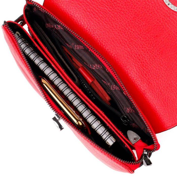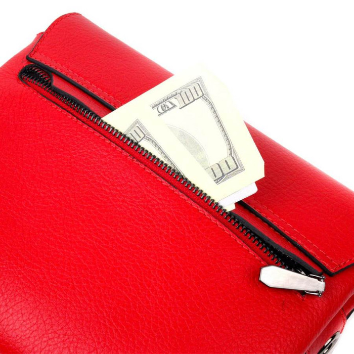 Небольшая вместительная женская сумка-клатч из натуральной зернистой кожи, красного цвета. Сумка функциональна и удобна в эксплуатации, качественная фурнитура серебристого цвета отлично дополняет стильный и незаурядный дизайн сумки.