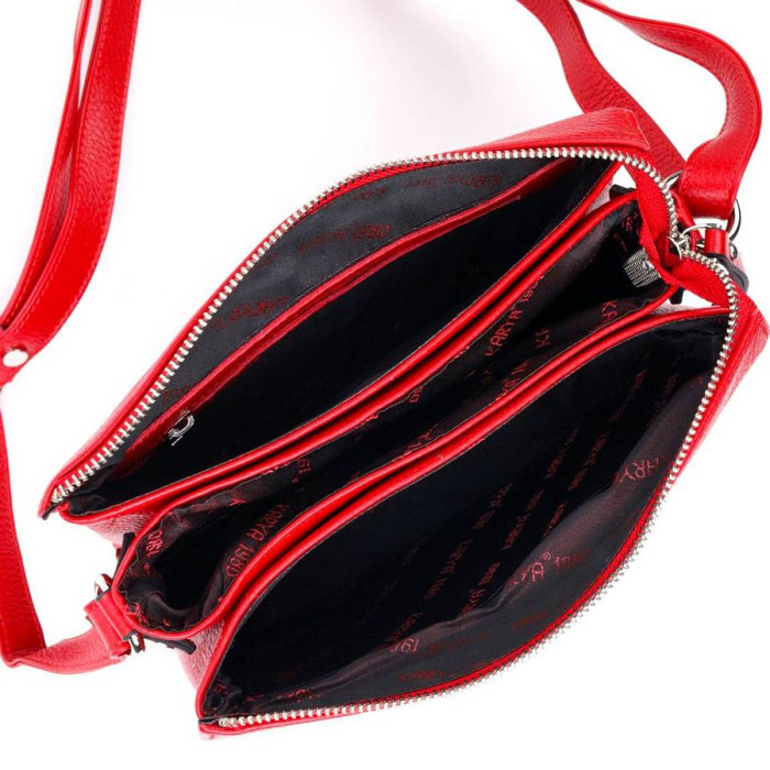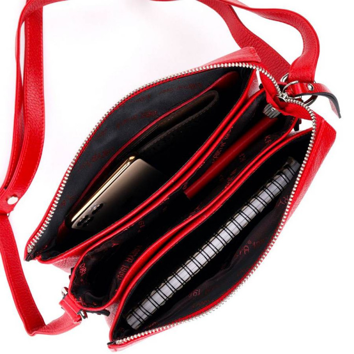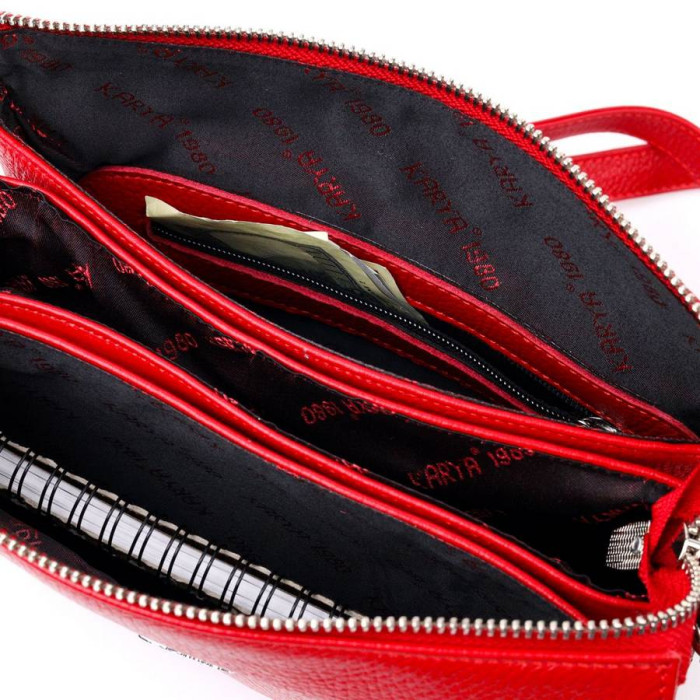Яркая компактная сумка небольшого размера из натуральной кожи, в красивом красном цвете. Фурнитура серебряного цвета. Сумку удобно носить на плече или через плечо. Сумка упакована в фирменный текстильный чехол Karya. Сумка из натуральной кожи всегда будет отличным подарком любой женщине.