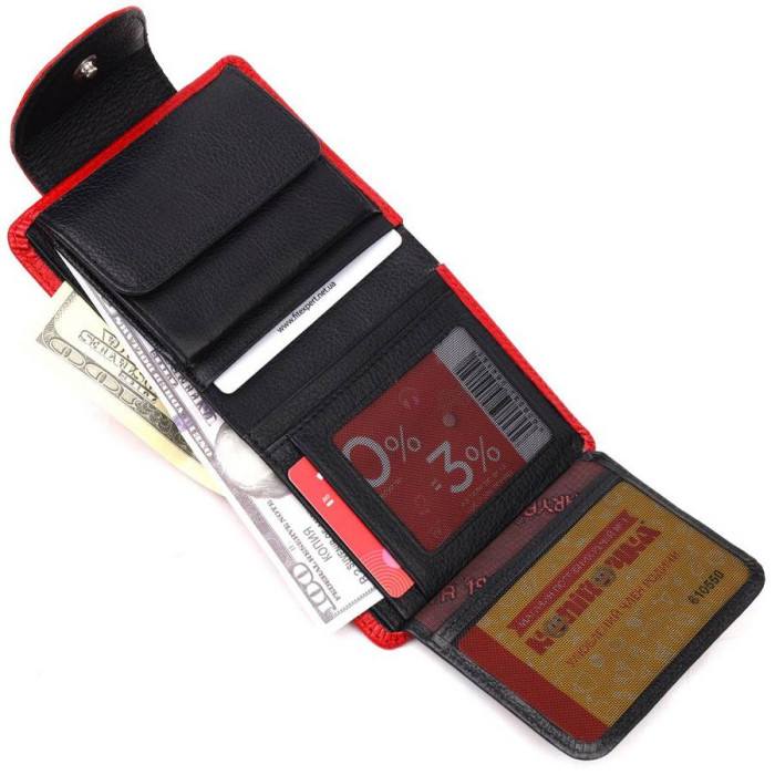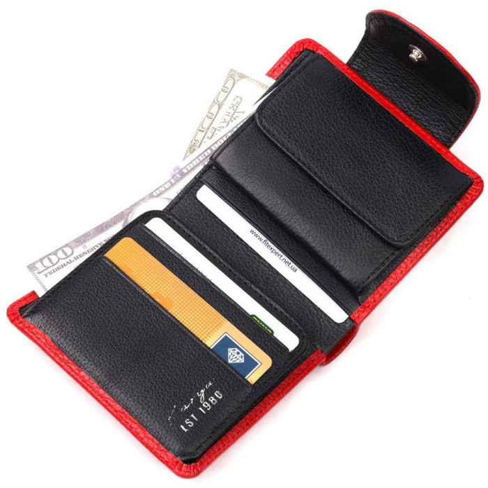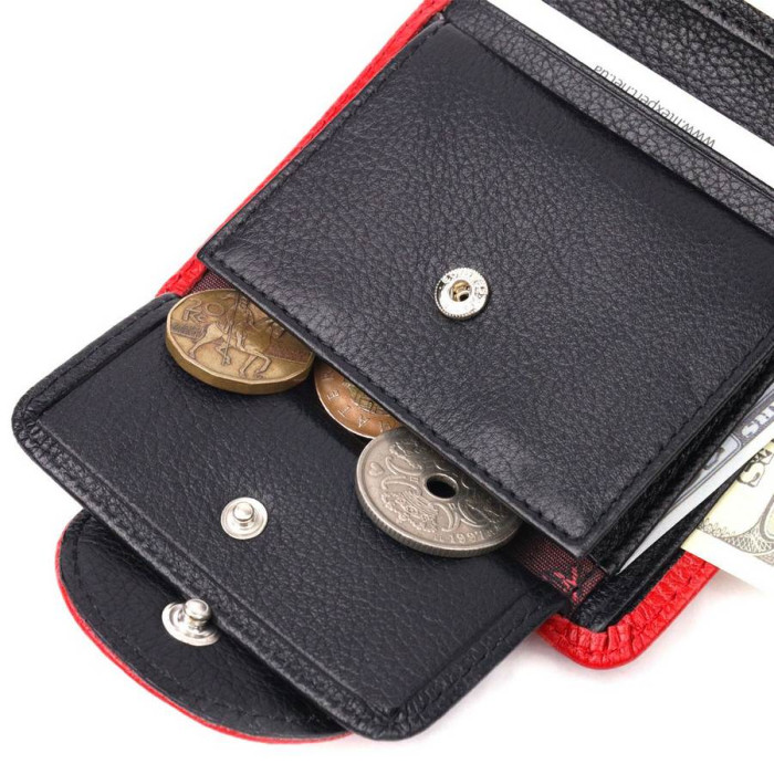 Практичный женский кошелек из натуральной кожи красный снаружи и черный внутри. Складывается аксессуар пополам, закрывается клапаном на кнопку. Качественная фурнитура дополняет и украшает изделие. Такой кошелек из натуральной кожи - это идеальный вариант на каждый день для тех, кто ценит качество, удобство и комфорт, а также будет отлично дополнять Ваш повседневный образ. Упакован аксессуар в фирменную коробку и пакет бренда. Изделия из натуральной кожи всегда будут отличным подарком для близкого человека.